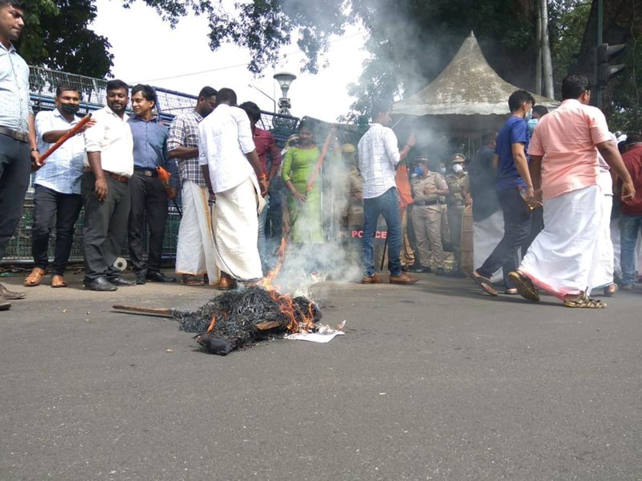 ഭരണഘടനയെ കുറിച്ച് വിവാദ പരാമര്ശം; മന്ത്രി സജി ചെറിയാന്റെ കോലം കത്തിച്ചു