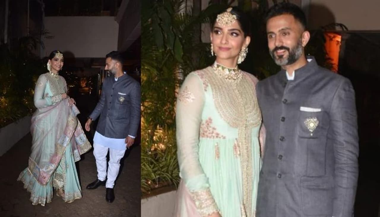 പൌഡര് ബ്ലൂ നിറത്തിലുള്ള അനാര്ക്കലി കുര്ത്തയാണ് സോനം ധരിച്ചത്.