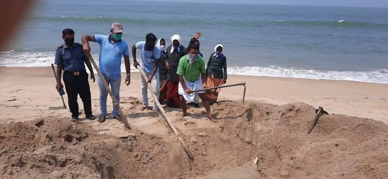 തിരൂര് പടിഞ്ഞാറെക്കര ബീച്ചില് കഴിഞ്ഞ ദിവസം കരയ്ക്കടിഞ്ഞ ഭീമന് ഡോള്ഫിന്റെ ജഡം കടല്കത്തീരത്ത് തന്നെ മറവ് ചെയ്യുന്നു.