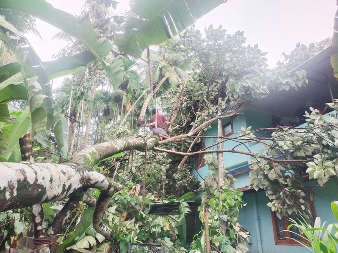 തെക്കത്തുപറമ്പ് ദേവയാനി, തുളുവന് കുഞ്ഞി മുഹമ്മദ് എന്നിവരുടെ വീടുകള്ക്ക് മുകളിലാണ് മരം വീണത്. വീട്ടില് ആളുണ്ടായിരുന്നെങ്കിലും പരുക്കേല്ക്കാതെ രക്ഷപ്പെട്ടു. നൂറോളം മരങ്ങളും തെങ്ങുകളും ജില്ലയിലെമ്പാടും കടപുഴകി വീണു.
