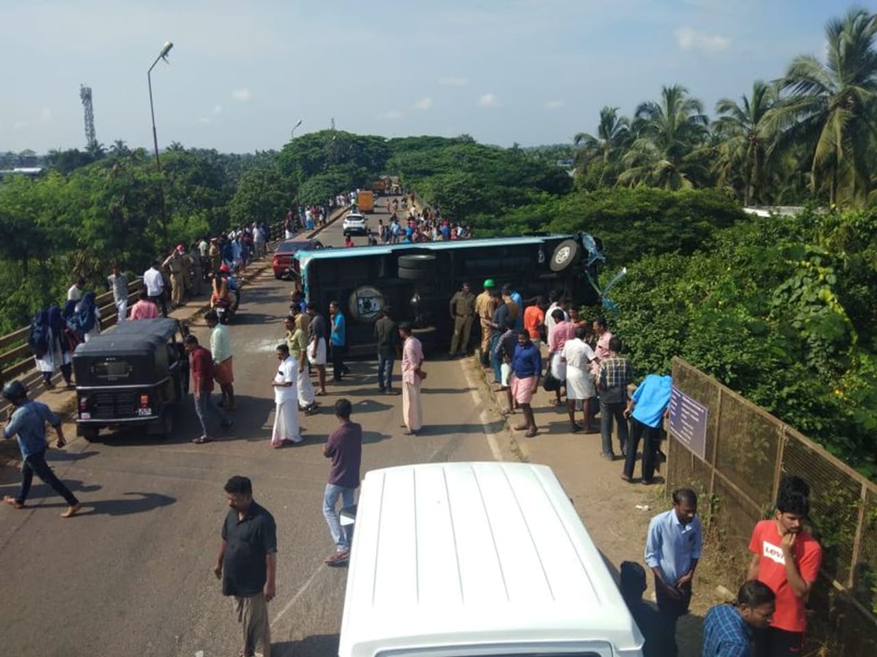 കുറ്റിപ്പുറം റെയില്വേ മേല്പ്പാലത്തില് സ്വകാര്യ ബസ് മറിഞ്ഞ് നിരവധി പേർക്ക് പരിക്ക്. മിനി ബസ് തലകീഴായി മറിഞ്ഞാണ് അപകടമുണ്ടായത്. ശനിയാഴ്ച രാവിലെ 8.15-ഓടെയാണ് അപകടമുണ്ടായത്. തലനാരിഴയ്ക്കാണ് വൻ ദുരന്തം ഒഴിവായത്. വളാഞ്ചേരിയില് നിന്ന് കുറ്റിപ്പുറത്തേക്ക് വരികയായിരുന്ന റോയല് ട്രാന്സ്പോര്ട്ട് ബസ് റെയില്വേ മേല്പ്പാലത്തില് നിയന്ത്രണംവിട്ട് മറിയുകയായിരുന്നു. ബസ് നിയന്ത്രണം വിട്ട് മറിഞ്ഞപ്പോള് ഡ്രൈവര് അറുപതടിയോളം താഴ്ചയിലേക്ക് വീണെങ്കിലും അത്ഭുതകരമായി രക്ഷപ്പെട്ടു. അപകടത്തിന്റെ ആഘാതത്തില് യാത്രക്കാരുടെ കയ്യിലുള്ള ബാഗും മറ്റും റെയിൽവേ ട്രാക്കിലേക്ക് വീണു. അപകടത്തില് 26 പേര്ക്ക് പരിക്കേറ്റെന്നാണ് പ്രാഥമിക വിവരം. പരിക്കേറ്റവരെ നടക്കാവ് സ്വകാര്യ ആശുപത്രിയില് പ്രവേശിപ്പിച്ചു. ആരുടേയും പരിക്ക് ഗുരുതരമല്ല. പൊലീസും നാട്ടുകാരും ചേര്ന്ന് സ്ഥലത്ത് രക്ഷാപ്രവർത്തനം തുടരുകയാണ്. ഏഷ്യാനെറ്റ് ക്യാമറാമാന് വിനോദ് കുളപ്പട എടുത്ത ചിത്രങ്ങള് കാണാം..right-side{display:none;} .left-side{width:100%;} .gallery-post h2.quotes.gd-h{font-size: 14px}