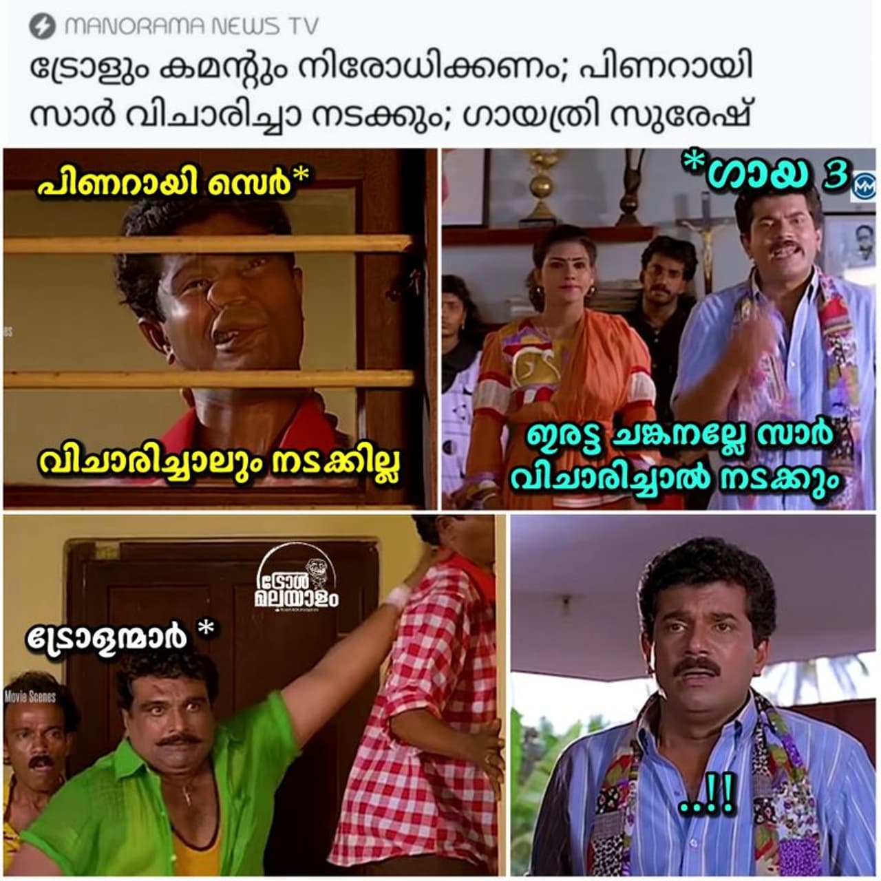 ഗായത്രി സുരേഷ്, മുഖമന്ത്രിയോടാണ് തന്റെ സങ്കടം പറഞ്ഞത്. അദ്ദേഹത്തെ ഏറെ ബഹുമാനിക്കുന്ന വ്യക്തിയാണ് താനെന്നും അദ്ദേഹത്തിന്റെ ഓരോ തീരുമാനത്തെയും ആദരവോടെ നോക്കികാണുന്ന ഒരാളാണ് താനെന്നും ഗായത്രി പറയുന്നു. പക്ഷേ, ട്രോളന്മാരുടെ മറുപടി ഇങ്ങനെയാണ്.....
