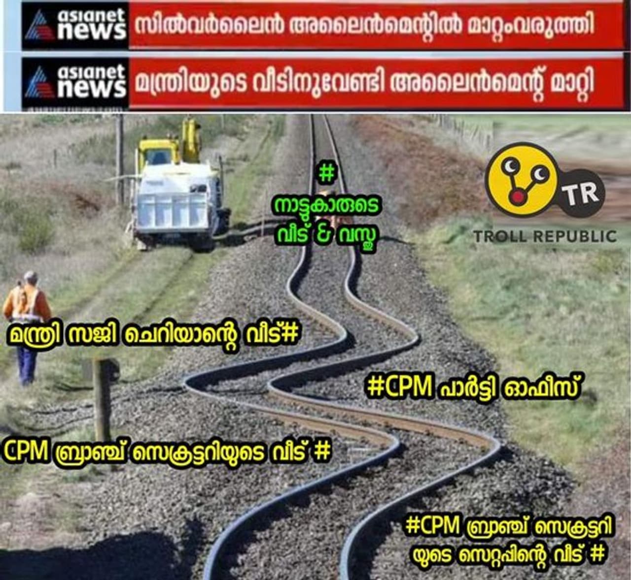 K rail Troll: ചില പ്രത്യേക ഇടങ്ങളില് വളഞ്ഞ് പോകുന്ന കെ റെയില്; കാണാം ട്രോളുകള്