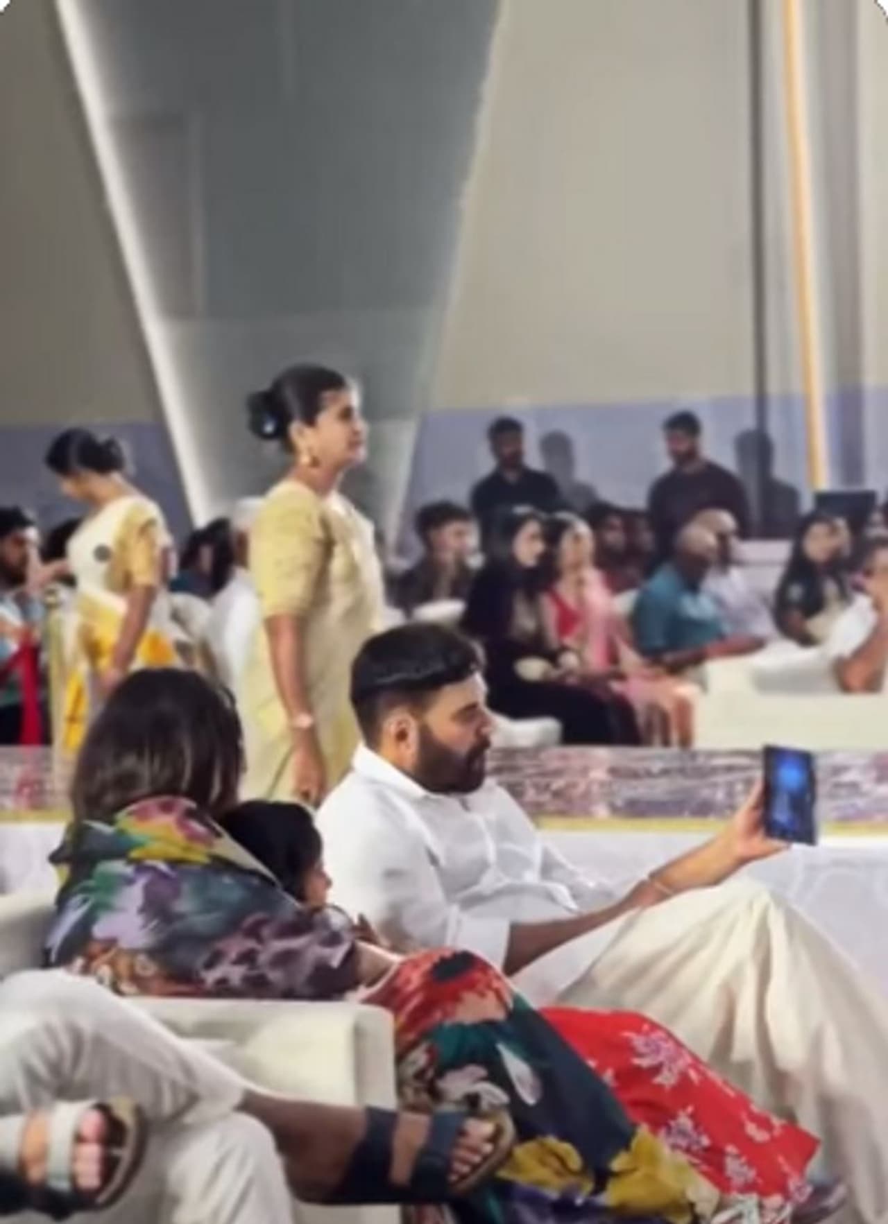 കൊച്ചുമകളുടെ കൈപിടിച്ചാണ് മമ്മൂട്ടി വധൂവരന്മാരെ അനുഗ്രഹിക്കാൻ വിവാഹ വേദിയില് എത്തിയത്. തുടര്ന്ന് ഇരുവരും ചേര്ന്നുള്ള നിമിഷങ്ങളും വൈറലാകുന്നുണ്ട്.