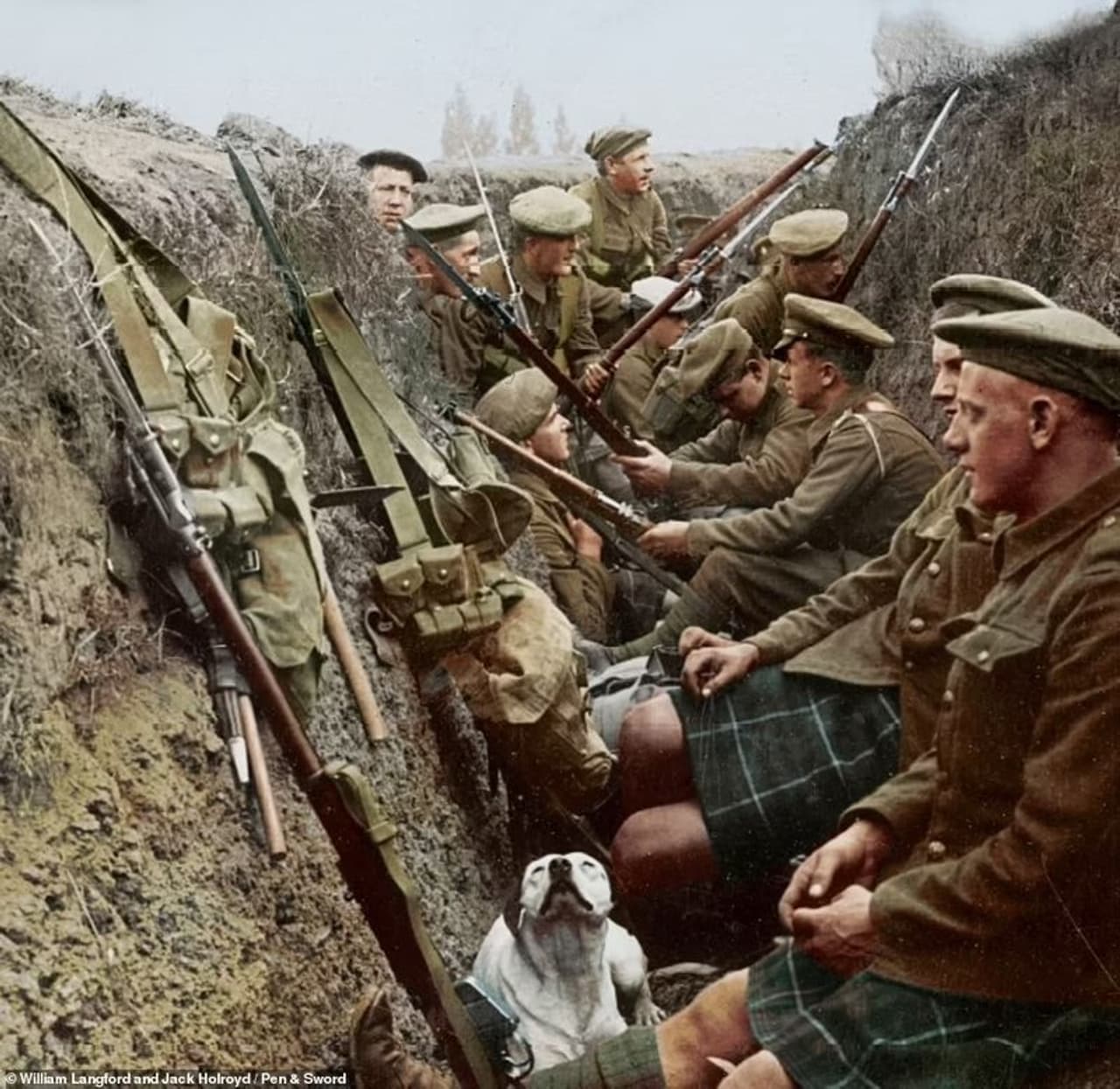 ജര്മ്മന് പട്ടാളം 'പാവാട ധരിച്ച ചെകുത്താന്മാർ' അല്ലെങ്കിൽ 'നരകത്തിൽ നിന്നുള്ള സ്ത്രീകൾ' എന്ന് വിളിച്ചിരുന്ന സ്കോട്ടിഷ് സൈനികർ പടിഞ്ഞാറന് സഖ്യത്തോടൊപ്പം ഒരു ട്രഞ്ചില് ഇരിക്കുന്നു. കൂടെ ഒരു പട്ടിയേയും കാണാം.