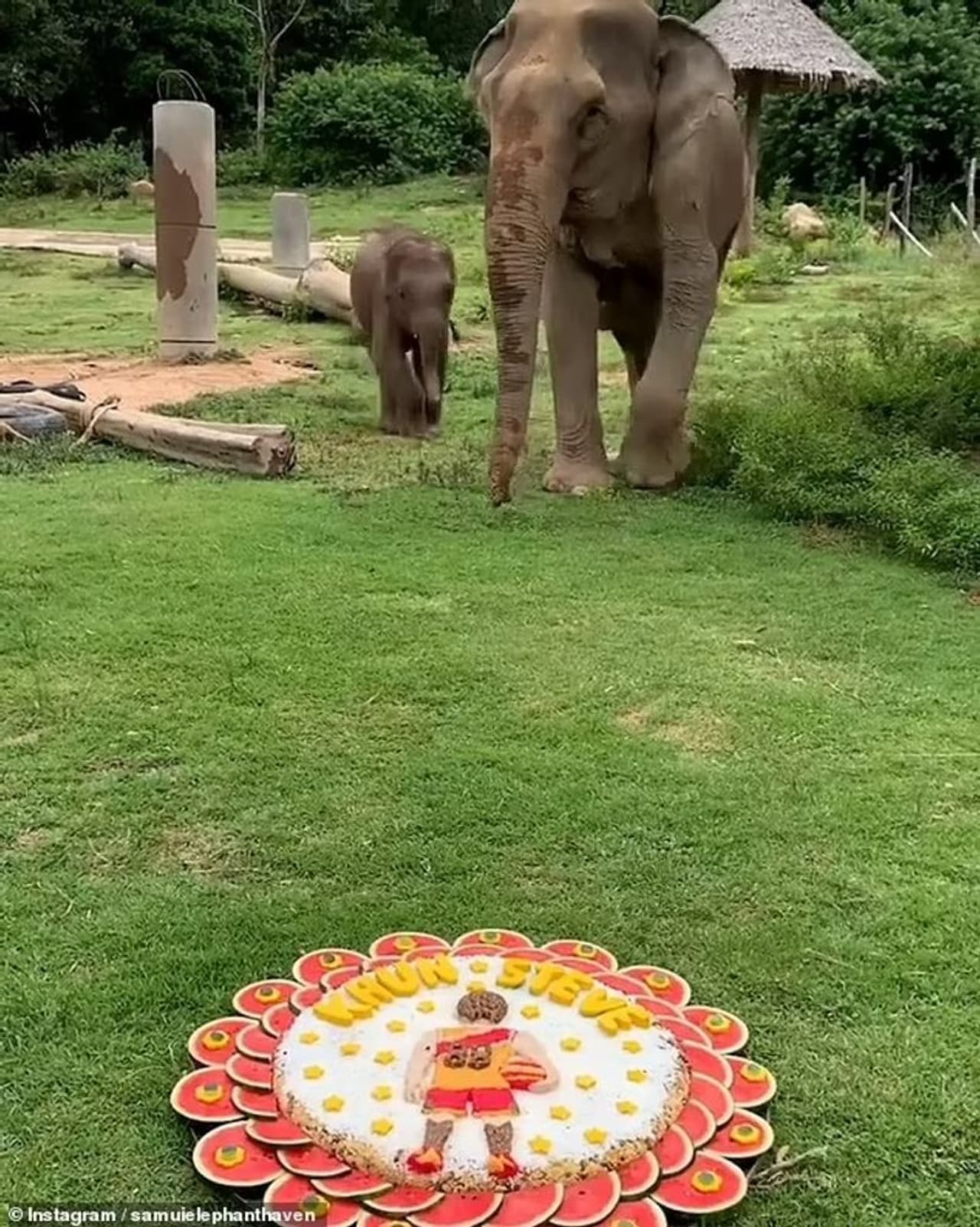 മുത്തശ്ശിയോടൊപ്പമാണ് കുട്ടിയാനയും ഭക്ഷണം കഴിക്കാനെത്തിയത്. എന്നാല്, കഴിക്കാനെത്തിയ പാടേ, മുന്നില് കണ്ട തണ്ണിമത്തന് കഷ്ണം ഏടുക്കാനായി അവന് ശ്രമിച്ചു. എന്നാല് അവന്റെ കുഞ്ഞിത്തുമ്പിക്കൈ കൊണ്ട് തണ്ണിമത്തന് കഷ്ണം എടുക്കാന് കഴിഞ്ഞില്ല.