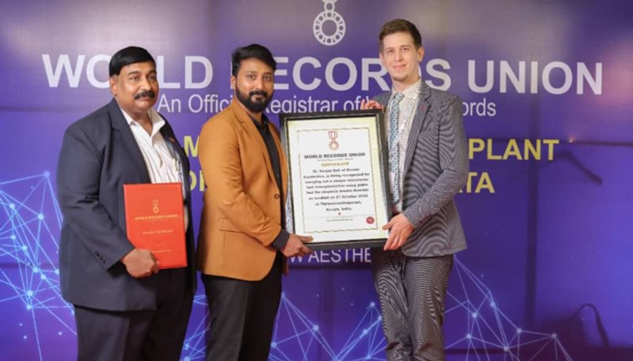 അലോപേഷ്യ ഏരിയേറ്റ (വട്ടത്തില് മുടി കൊഴിയുന്ന അസുഖം) ബാധിതനായ വ്യക്തിക്ക് മീശ മാറ്റി വയ്ക്കല് ശസ്ത്രക്രിയ നടത്തിയ റിന്യു എസ്തറ്റിക്സ് ക്ലിനിക്കിലെ ഡോ. ദീപു സതി വേള്ഡ് റെക്കോര്ഡില് ഇടം നേടി. അലോപേഷ്യ ഏരിയേറ്റ അസുഖം ബാധിച്ച ഒരാള് ആത്മഹത്യയുടെ വക്കിലായിരുന്നു. തലമുടിക്ക് പിന്നാലെ മീശയും കണ്പുരികവും രോഗം ബാധിച്ചു കൊഴിയാന് തുടങ്ങി. സമൂഹത്തെ അഭിമുഖീകരിക്കാന് പോലും കഴിയാതെ അയാള് മാനസിക സംഘര്ഷത്തിലായിരുന്നു. ജീവിതം മടുത്ത നിമിഷത്തിലാണ് അയാള് തിരുവനന്തപുരം മുറിഞ്ഞപാലത്തുള്ള റിന്യു എസ്തറ്റിക്സ് ക്ലിനിക്കിലെ ഡോ. ദീപു സതിയെ കാണാനെത്തുന്നത്.