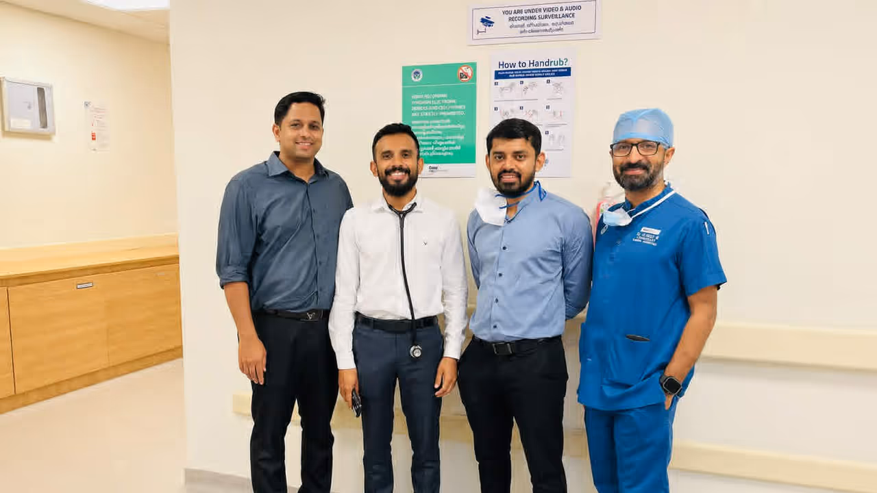 ഫോട്ടോ ക്യാപ്ഷൻ- ചികിത്സയ്ക്ക് നേതൃത്വം നൽകിയ ക്രിട്ടികൽ കെയർ വിഭാഗം ഡയറക്ടർ ഡോ. അമിത് ശ്രീധരൻ, ക്രിട്ടികൽ കെയർ വിഭാഗം മേധാവി ഡോ. റിനോയ് ചന്ദ്രൻ, ഇന്റർ വെൻഷണൽ പൾമനോളജി വിഭാഗം ഡോ. വിഷ്ണു ജി കൃഷ്ണൻ, കാർഡിയക് തൊറാസിക് ആൻഡ് വസ്ക്കുലർ സർജറി വിഭാഗം മേധാവി ഡോ. പ്രസാദ് സുരേന്ദ്രൻ, കാർഡിയക് അനസ്തെഷ്യോളജി വിഭാഗം ഡോ.ഗണേഷ് എന്നിവർ.