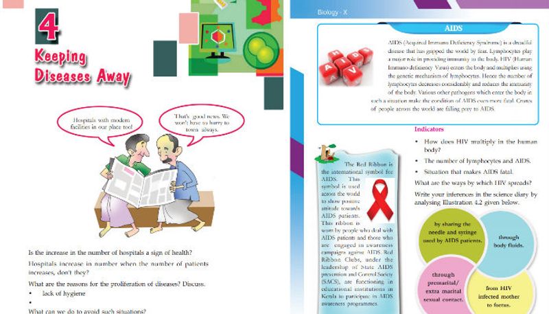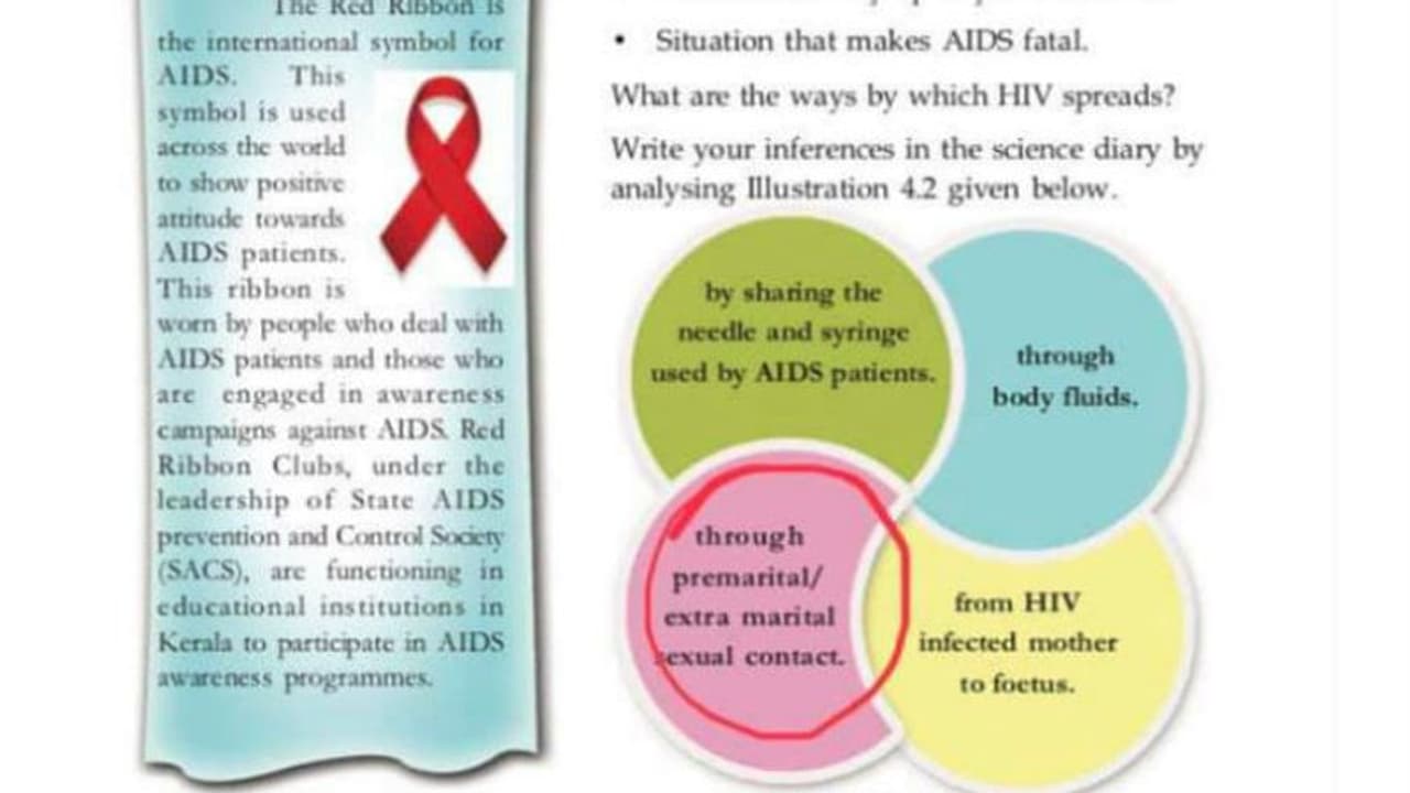 കേരള സിലബസില് ഉള്പ്പെടുന്ന ബയോളജി പാഠപുസ്തകത്തിലെ ഭാഗമാണ് വലിയ ചര്ച്ചകള് ഉയര്ത്തുന്നത്. എയ്ഡ്സ് രോഗത്തെക്കുറിച്ച് വിശദമാക്കുന്ന അധ്യായത്തില് നാല് രീതികളിലൂടെയാണ് പ്രധാനമായും എയ്ഡ്സ് പകരുന്നത് എന്ന് പറയുന്നു. തുടര്ന്ന് ആ നാല് രീതിയും പാഠഭാഗത്തില് വിശദമാക്കുന്നുണ്ട്