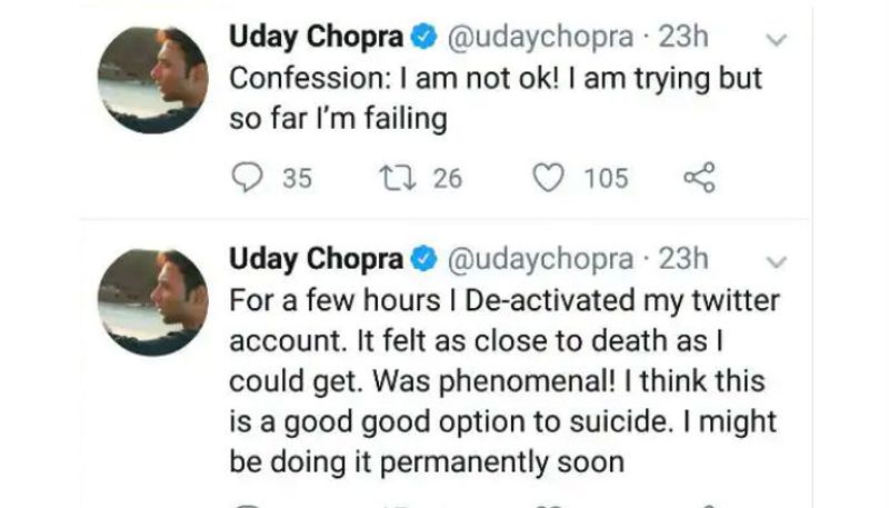 താന് പ്രശ്നത്തിലാണെന്നും എത്ര ശ്രമിച്ചിട്ടും 'ഓക്കെ'യാകാന് ആവുന്നില്ലെന്നും തുറന്നെഴുതി ബോളിവുഡ് നടന് ഉദയ് ചോപ്ര. ആത്മഹത്യയെക്കുറിച്ച് പരോക്ഷമായി സൂചിപ്പിക്കുന്ന വരികളും ഉദയ് ട്വീറ്റ് ചെയ്തു. എന്നാല് സംഗതി ആരാധകര്ക്കിടയില് വലിയ ചര്ച്ചയായതോടെ മണിക്കൂറുകള്ക്കകം തന്നെ രണ്ട് ട്വീറ്റും ഉദയ് പിന്വലിച്ചു.