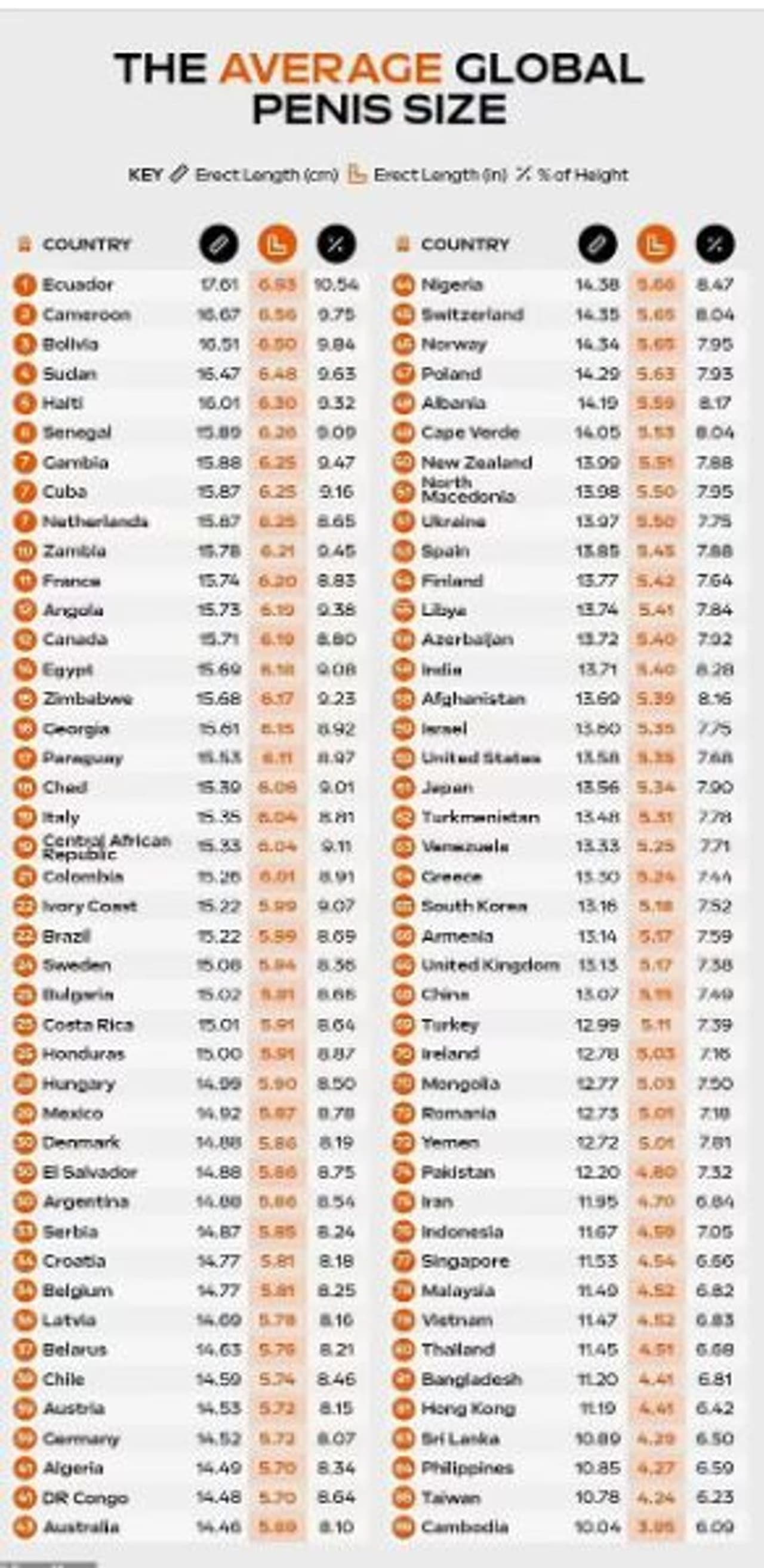 സുഡാനും കരീബിയൻ രാജ്യമായ ഹെയ്തിയും യഥാക്രമം 16.47 സെന്റിമീറ്ററും 16.01 സെന്റിമീറ്ററുമായി ആദ്യ അഞ്ച് സ്ഥാനങ്ങളിൽ എത്തി. യുഎസിലെ പുരുഷന്മാർ ശരാശരി 13.58 സെന്റീമീറ്റർ വലുപ്പം രേഖപ്പെടുത്തി. ഒരു പുരുഷന്റെ ലിംഗത്തിന്റെ വലുപ്പം പലപ്പോഴും അവരുടെ ആത്മവിശ്വാസത്തിന് വലിയ സ്വാധീനം ചെലുത്തുമെന്ന് പഠനം അവലോകനം ചെയ്ത ഫാർമസിസ്റ്റ് നവീൻ ഖോസ്ല പറഞ്ഞു. 13.71 സെന്റീമീറ്റർ രേഖപ്പെടുത്തി ഇന്ത്യ 56ാം സ്ഥാനത്താണ്.