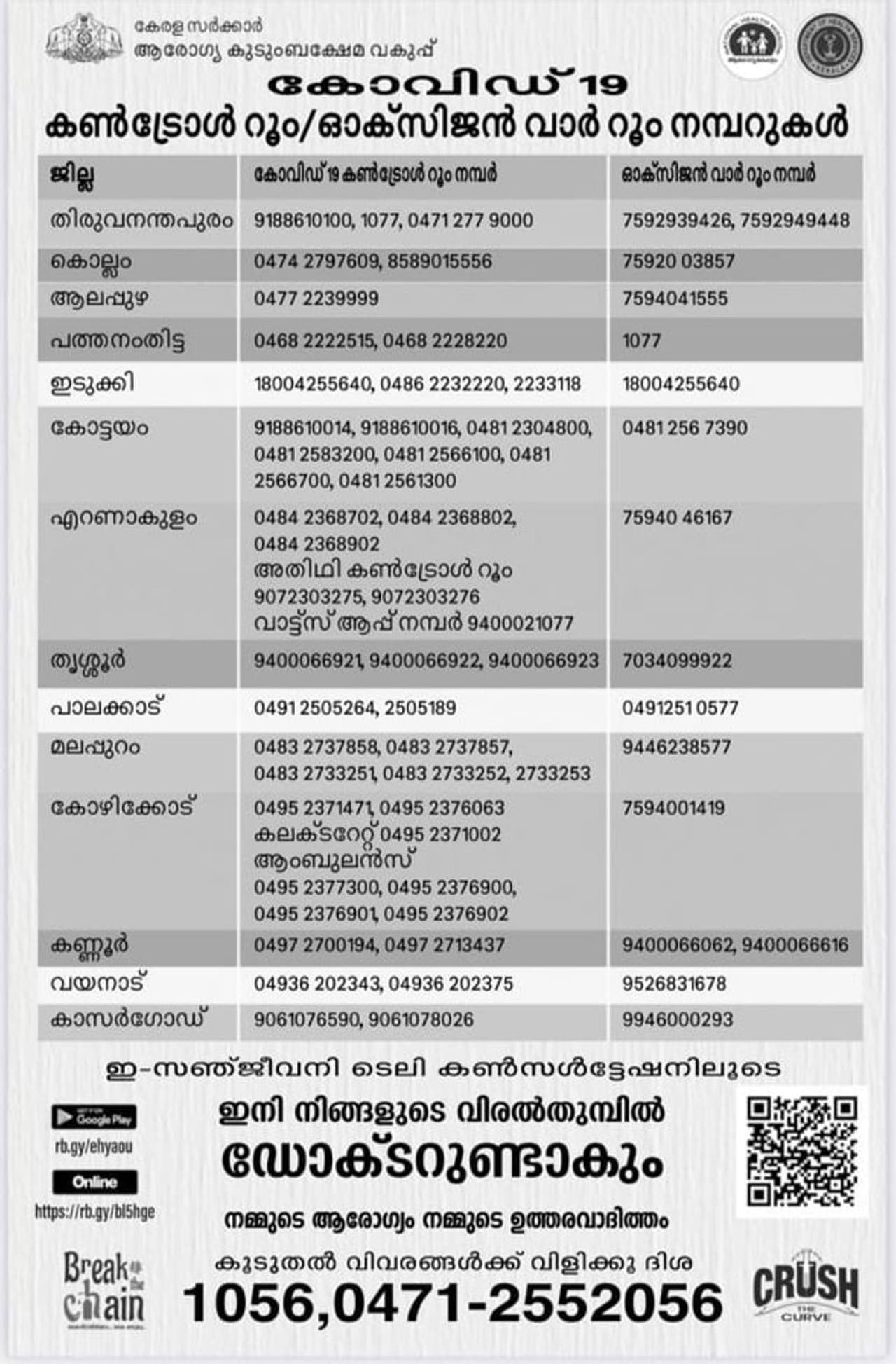 കേരളത്തിൽ ഓക്സിജൻ ലഭ്യമാകുന്ന കൺട്രോൾ റൂം നമ്പരുകൾ പങ്കുവച്ചിരിക്കുകയാണ് കേരള സർക്കാരിന്റെ ആരോഗ്യ കുടുംബക്ഷേമ വകുപ്പ്.