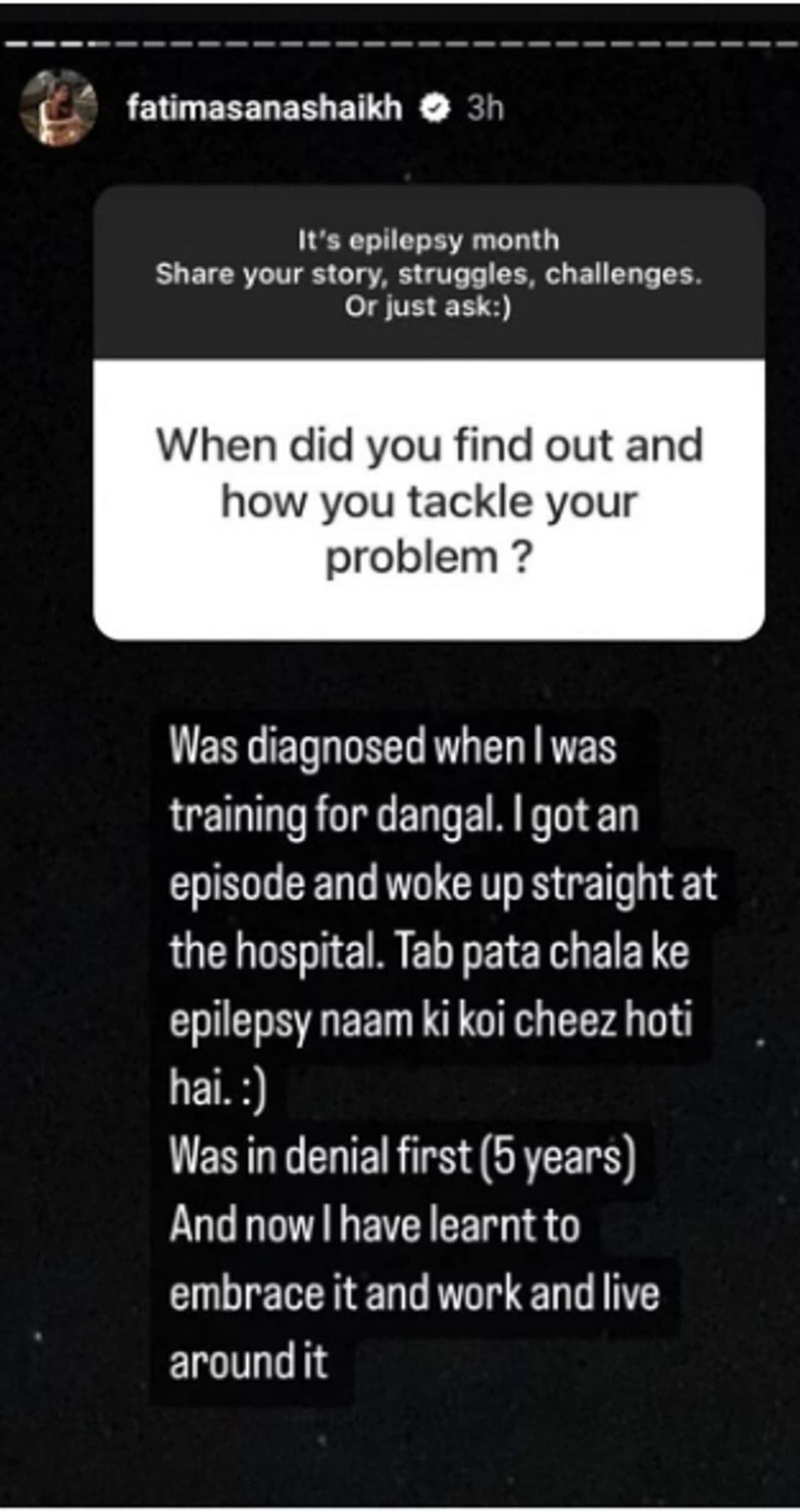 സാമൂഹിക മാധ്യമത്തിലൂടെയാണ് ഫാത്തിമ സന അനുഭവം പങ്കുവെച്ചിരിക്കുന്നത്. ഇന്സ്റ്റഗ്രാമിലെ തന്റെ ഫോളോവേഴ്സിനോട് അപസ്മാരത്തെക്കുറിച്ചുള്ള അവരുടെ കഥകളും നേരിട്ട വെല്ലുവിളികളും പ്രതിസന്ധികളും പങ്കുവയ്ക്കാൻ പറഞ്ഞുകൊണ്ടാണ് ഫാത്തിമ ആരംഭിച്ചത്.