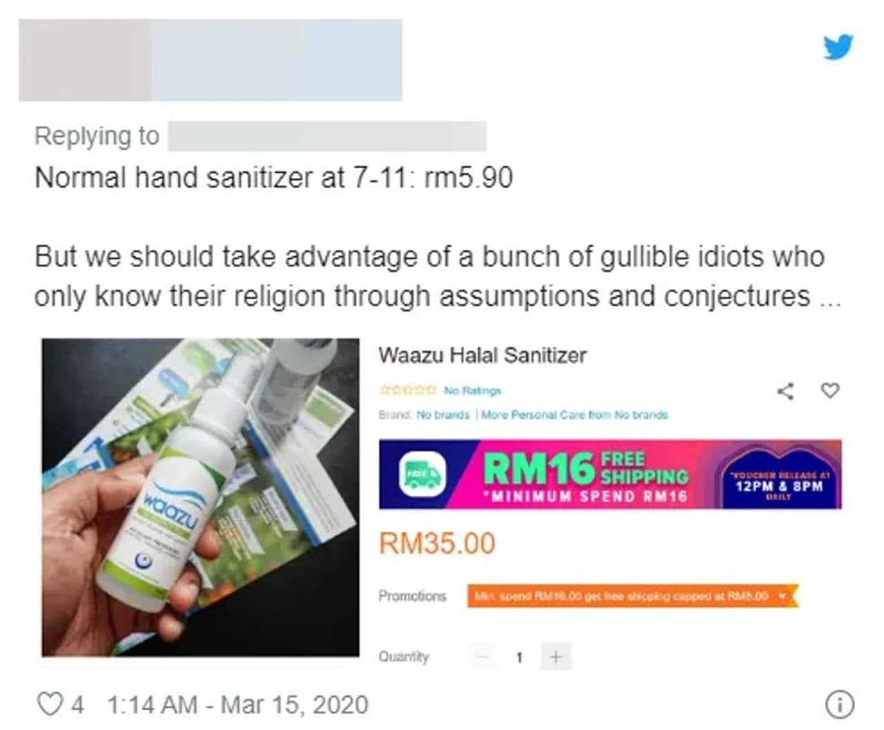 ജനങ്ങളുടെ ഈ ആശങ്ക മുതലെടുത്തുകൊണ്ടാണ് കലക്കവെള്ളത്തിൽ മീൻ പിടിക്കാൻ ശ്രമിക്കുന്ന ചില വീരന്മാർ പുതിയ തട്ടിപ്പും കൊണ്ട് ഇറങ്ങിയത്. ഇന്റർനെറ്റ് വഴിയാണ് പ്രധാന കച്ചവടം. 'ഹലാൽ' ആൽക്കഹോൾ ഫ്രീ സാനിറ്റൈസർ എന്നതാണ് അവരുടെ ഓഫർ. 100 % ഹലാലാണ് ഈ ഉത്പന്നം, തികച്ചുംഇസ്ലാമികവും. 75 ശതമാനം വരുന്ന ഹൈ പ്യൂരിറ്റി എത്തനോൾ ചേർത്തുണ്ടാക്കിയ ഈ സാനിറ്റൈസർ 60 മില്ലിക്ക് അവർ ചാർജ്ജ് ചെയ്തത് 16 മലേഷ്യൻ റിങ്കിറ്റ് ആണ്. അതായത് നമ്മുടെ 250 രൂപയോളം. പലരും അതിനെ 'മുസ്ലിം ഫ്രണ്ട്ലി' എന്നൊക്കെ ടാഗ് ചെയ്തതായി വില്പന. ഇതിൽ തന്നെ കൂടിയ ഇനം വരുന്നത് ഏകദേശം 35 റിങ്കിറ്റ് വിലയ്ക്കാണ്. സാധാരണ സാനിറ്റൈസറിന് മലേഷ്യയിൽ വെറും 6 റിങ്കിറ്റ് മാത്രമാണ് വില എന്നോർക്കണം. അതായത്, 'ഹലാൽ' സാനിറ്റൈസർ ഇവർ വിൽക്കുന്നത് ചുരുങ്ങിയത് ആറിരട്ടിയെങ്കിലും വിലയ്ക്കാണ്.