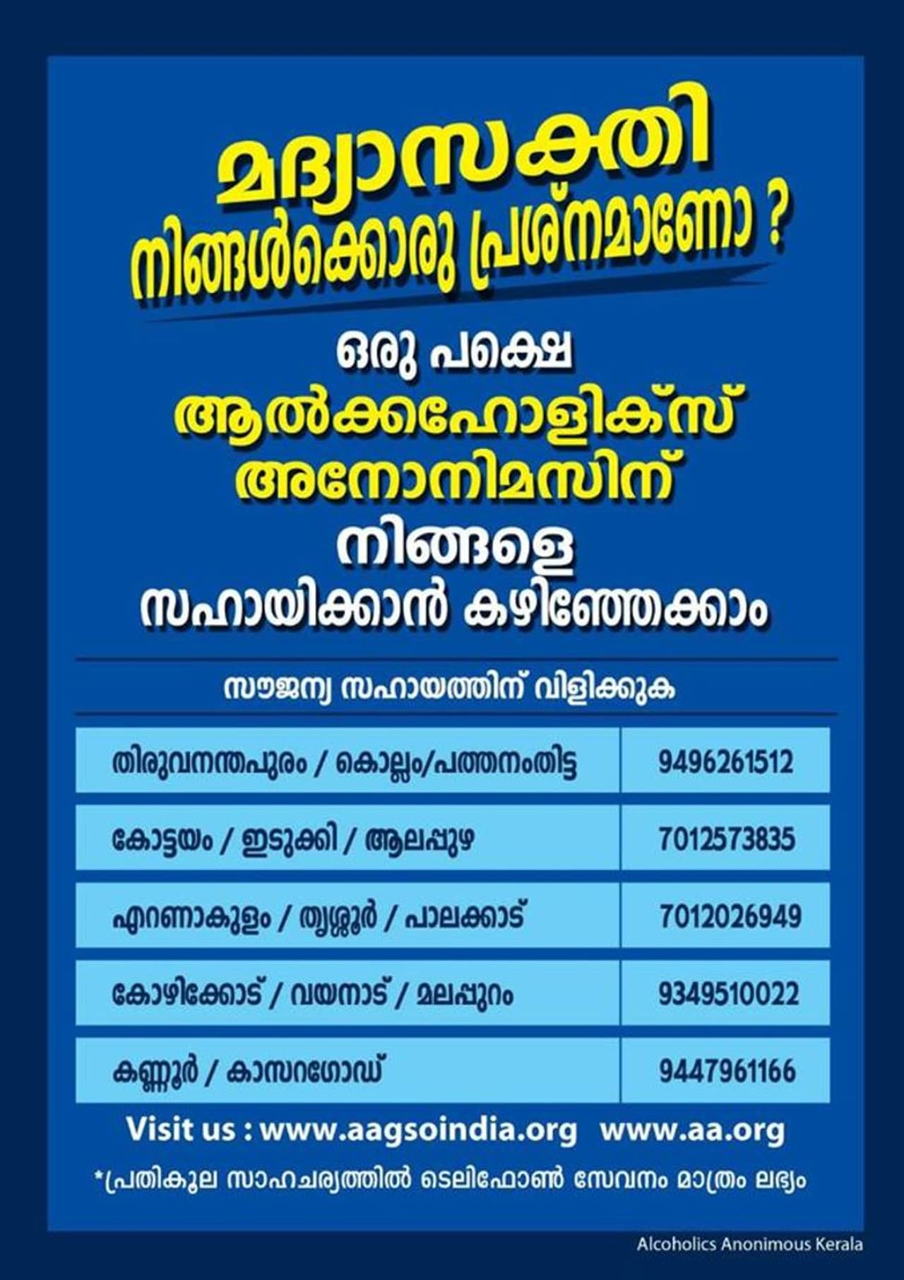 തുടക്കത്തിൽ അൽപമൊന്ന് ബുദ്ധിയെങ്കിലും ഇപ്പോൾ വലിയ സന്തോഷം തോന്നുന്നുവെന്ന് അദ്ദേഹം പറയുന്നു. 'ഇന്നത്തെ ഒരു ദിവസം മാത്രം കുടിക്കാതിരിക്കാൻ ശ്രമിക്കൂ' എന്ന് മാത്രമാണ് എ.എ കൂട്ടായ്മയിലെ ചിലർ തന്നോട് പറഞ്ഞത്. ഇങ്ങനെ പറഞ്ഞ് പറഞ്ഞാണ് അഞ്ച് വർഷമായി താൻ ഇപ്പോൾ മദ്യപിക്കാറില്ലെന്നാണ് അദ്ദേഹം പറഞ്ഞു. ഈ ലോക് ഡൗൺ സമയത്ത് മദ്യം കിട്ടാതെ വരുമ്പോൾ ആത്മഹത്യ ചെയ്താലോ എന്ന് ചിന്തിക്കുന്നവരുണ്ടാകും. അങ്ങനെയുള്ളവരെ ഈ കൂട്ടായ്മ സഹായിക്കും. അതിനായി താഴേ പറയുന്ന ഈ നമ്പറുകളിൽ വിളിക്കാവുന്നതാണ്.....