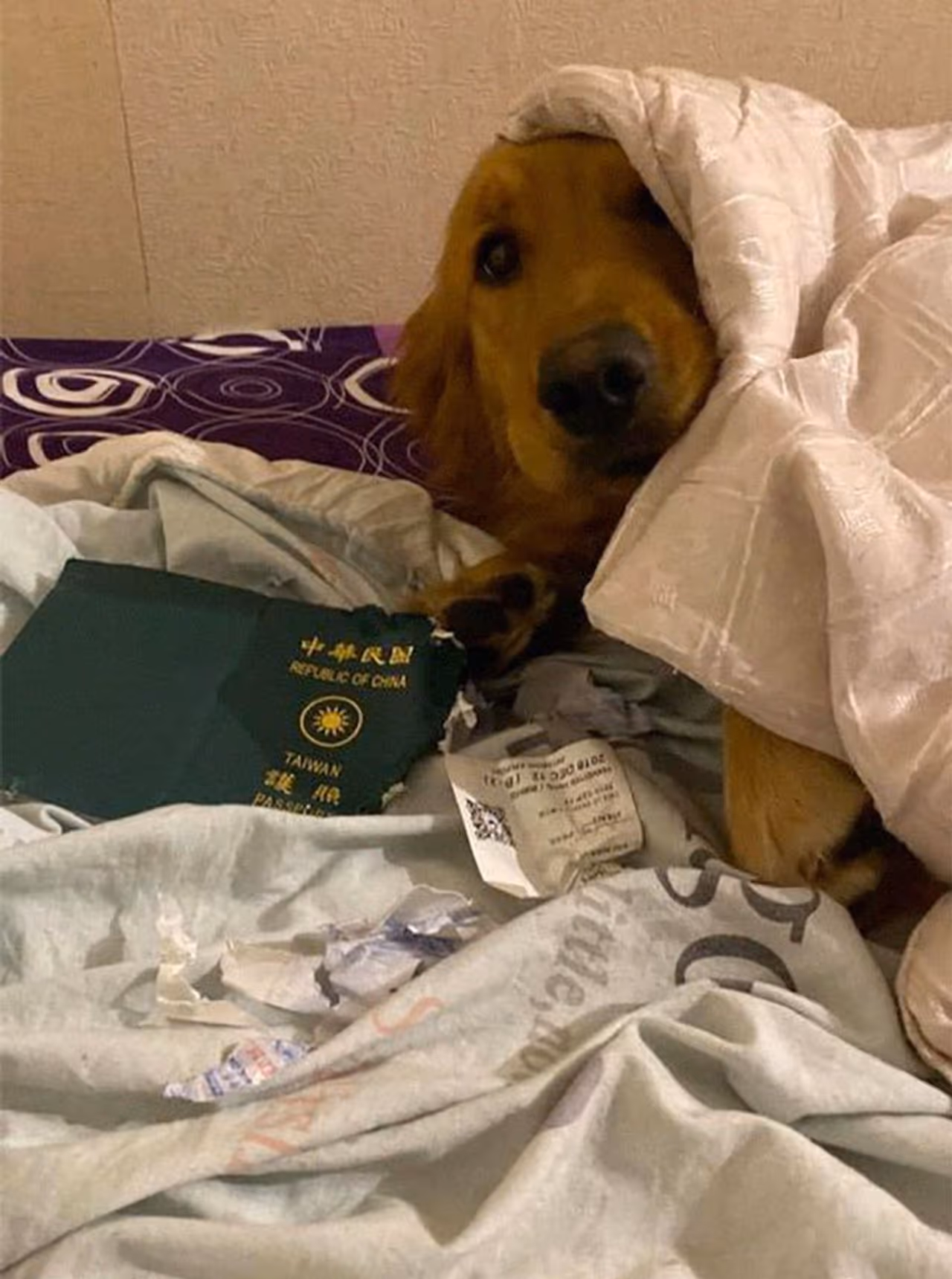 കൊറോണാവൈറസ് എന്തെന്നുപോലും അറിയാത്ത ഈ യുവതി വുഹാനിലേക്ക് യാത്രപുറപ്പെടാനുള്ള പ്ലാനിലായിരുന്നു. എല്ലാ തയ്യാറെടുപ്പുകളും പൂർത്തിയാക്കി യാത്ര തുടങ്ങുന്നതിന്റെ തലേദിവസമാണ് അപ്രതീക്ഷിതമായി അവരുടെ പട്ടിക്കുട്ടി ഒരു പണിയൊപ്പിച്ചത്. ഒന്ന് പുറത്തുപോയി തിരിച്ചുവന്നപ്പോഴേക്കും, അവർ കണ്ടത് കടിച്ചുപറിച്ച് കഷണങ്ങളാക്കിയ പാസ്സ്പോർട്ടിനൊപ്പം, മുഖത്ത് നേരിയൊരു കുറ്റബോധത്തോടെ ഇരിക്കുന്ന തന്റെ ഗോൾഡൻ റിട്രീവർ പട്ടിക്കുട്ടിയെയാണ്. പട്ടി ആ പാസ്പോർട്ടിന്റെ കടിച്ചു കീറി ഉപയോഗ ശൂന്യമാക്കികളഞ്ഞു. അത് അവരുടെ യാത്രയ്ക്ക് അവിചാരിതമായ തടസ്സമുണ്ടാക്കി. പ്ലാൻ ചെയ്തപോലെ അവർക്ക് യാത്രചെയ്യാൻ സാധിച്ചില്ല.