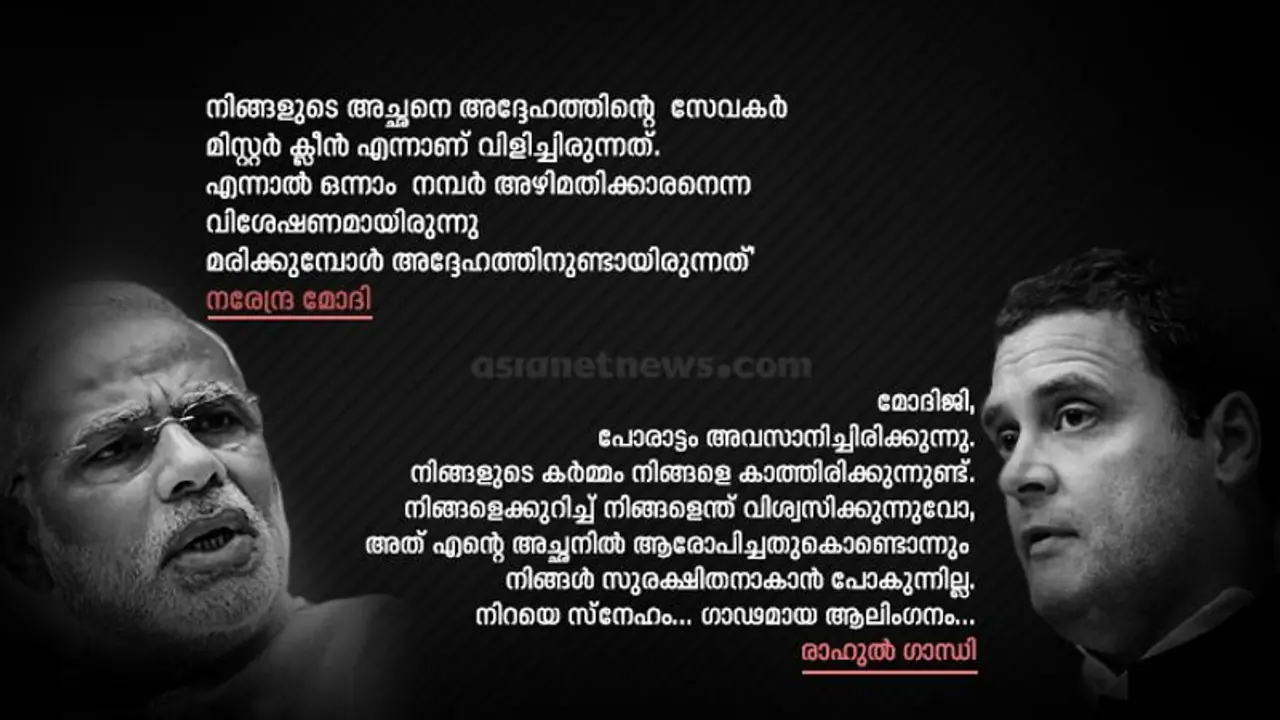 'മോദിജി, പോരാട്ടം അവസാനിച്ചിരിക്കുന്നു. നിങ്ങളുടെ കര്മ്മം നിങ്ങളെ കാത്തിരിക്കുന്നുണ്ട്. നിങ്ങളെക്കുറിച്ച് നിങ്ങളെന്ത് വിശ്വസിക്കുന്നുവോ, അത് എന്റെ അച്ഛനില് ആരോപിച്ചതു കൊണ്ടൊന്നും നിങ്ങള് സുരക്ഷിനാകാന് പോകുന്നില്ല. നിറയെ സ്നേഹം... ഗാഢമായ ആലിംഗനം...'- ഇതായിരുന്നു രാഹുലിന്റെ മറുപടി.