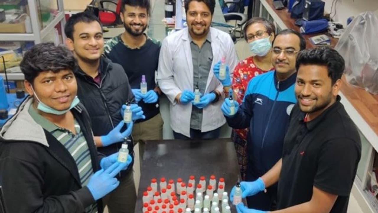 ഗവേഷണ വിദ്യാര്ത്ഥികളായ സിദ്ധാര്ത്ഥ് ശര്മ്മ, വൈഭവ് ജെയിന് എന്നിവരാണ് സുഹൃത്തുക്കളുടേയു അധ്യാപകരുടേയും സഹായത്തോടെ സാനിറ്റൈസര് തയ്യാറാക്കിയിരിക്കുന്നത്. ലോകാരോഗ്യ സംഘടനയും സെന്റര് ഫോര് ഡിസീസ് കണ്ട്രോള് ആന്റ് പ്രിവന്ഷന് (സിഡിസി)യും അംഗീകരിച്ച ഫോര്മുലയാണ് തങ്ങള് പിന്തുടര്ന്നിരിക്കുന്നതെന്ന് ഇവര് പറയുന്നു. 1500 കുപ്പി സാനിറ്റൈസറാണ് ഇതുവരെയായി ഇവര് തയ്യാറാക്കിയിട്ടുള്ളത്. ഇനിയിത് ക്യംപസിനകത്ത് തന്നെ സൗജന്യമായി വിതരണം ചെയ്യാനാണ് ഇവര് ഉദ്ദേശിക്കുന്നത്.