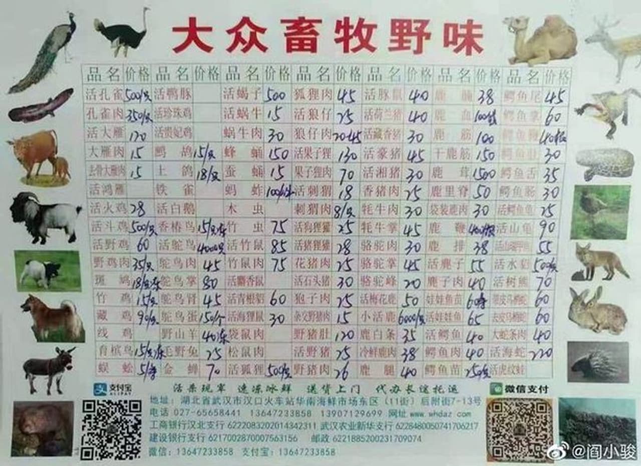 കൊറോണാവൈറസ് പൊട്ടിപ്പുറപ്പെട്ടു എന്ന് കരുതുന്ന വുഹാനിലെ ഹുവാനൻ സീഫുഡ് മാർക്കറ്റിൽ സാധാരണ മത്സ്യമാംസാദികൾക്ക് പുറമെ അനധികൃതമായി ജീവനോടെ അറുത്ത് വിറ്റുകൊണ്ടിരുന്നത് പാമ്പിനെയും, പെരുച്ചാഴിയെയും, മുതലയേയും, മുള്ളൻപന്നിയെയും, നീര്നായയെയും, ചെന്നായ്ക്കുഞ്ഞുങ്ങളെയും ഒക്കെ ആയിരുന്നു എന്ന് റിപ്പോർട്ടുകൾ. വൈറസ് ബാധയെത്തുടർന്ന് അധികൃതർ ഈ മാർക്കറ്റ് അടച്ചു പൂട്ടിയിരിക്കുകയാണിപ്പോൾ.