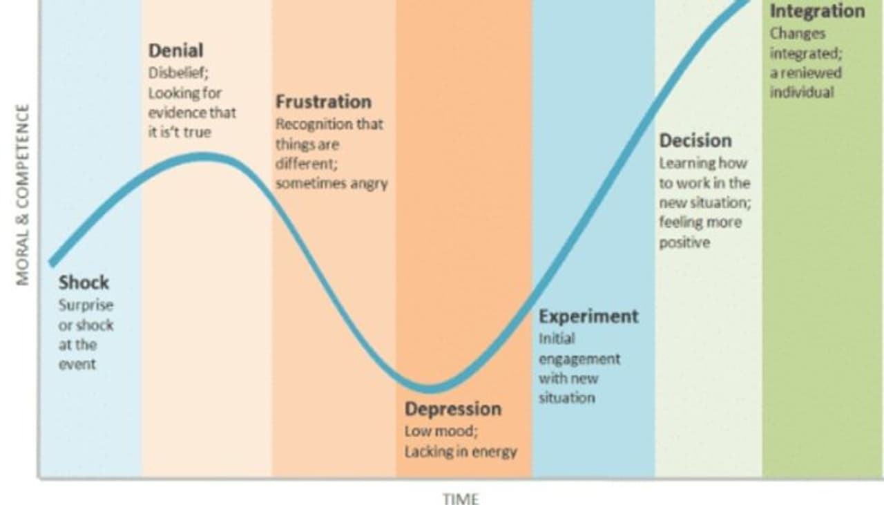 മരണത്തെക്കുറിച്ചോ അതിജീവനത്തെക്കുറിച്ചോ കഠിനമായ ആശങ്കയനുഭവിക്കുന്ന ഒരാള്, അല്ലെങ്കില് ഇവയ്ക്ക് സമാനമായ ഏതെങ്കിലും പ്രതിസന്ധിയിലൂടെ കടന്നുപോകുന്ന ഒരാള് അനുഭവിക്കുന്ന വൈകാരികാവസ്ഥകളുടെ വിവിധ ഘട്ടങ്ങളാണ് ഇതില് വിശദീകരിക്കുന്നത്. ആദ്യത്തേത്, കടന്നുവന്ന പ്രശ്നത്തില് 'ഷോക്ക്' അഥവാ ഞെട്ടല് ഉളവാകുന്ന ഘട്ടമാണ്. രണ്ടാമത്തേത് പ്രശ്നത്തോട് മുഖം തിരിക്കുന്ന ഘട്ടം. പ്രശ്നം നിലനില്ക്കുന്നില്ലെന്ന് വരെ ഈ ഘട്ടത്തില് സ്വയം വാദിച്ചേക്കാം. മൂന്നാമത്തേത്, പ്രശ്നത്തിന് മുകളിലുണ്ടാകുന്ന ദേഷ്യം, ഇച്ഛാഭംഗം എന്നിവയുടേത്. നാലാമത്തേത് നിരാശയുടെ അവസ്ഥ. അഞ്ചാം ഘട്ടത്തില് നിരാശയെ മറികടക്കാനുള്ള പരിശ്രമങ്ങളുടേതാണ്. ആറാം ഘട്ടമാകുമ്പോള് പുതിയ സാഹചര്യങ്ങളെ എങ്ങനെയെല്ലാം മറികടക്കണമെന്ന പഠനമാണ്. ഏഴാം ഘട്ടമെത്തിയാല് ഏത് പ്രതിസന്ധിയിലും മുന്നോട്ടുപോവുകയെന്ന നിശ്ചയദാര്ഢ്യമാണ്.