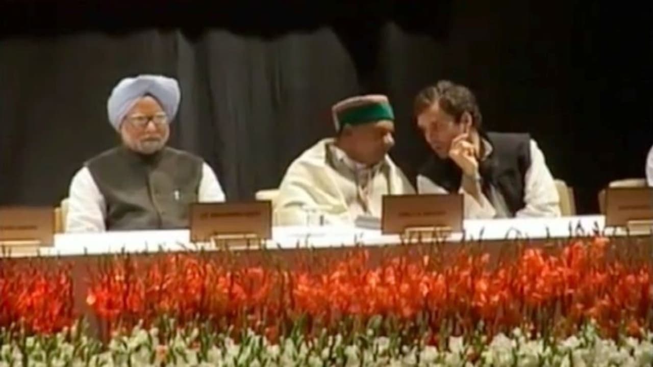 2013 ലെ ചിന്തൻ ശിബിറിൽ രാഹുൽ ഗാന്ധി, മൻമോഹൻ സിംഗ്, എ കെ ആന്റണി എന്നിവർ