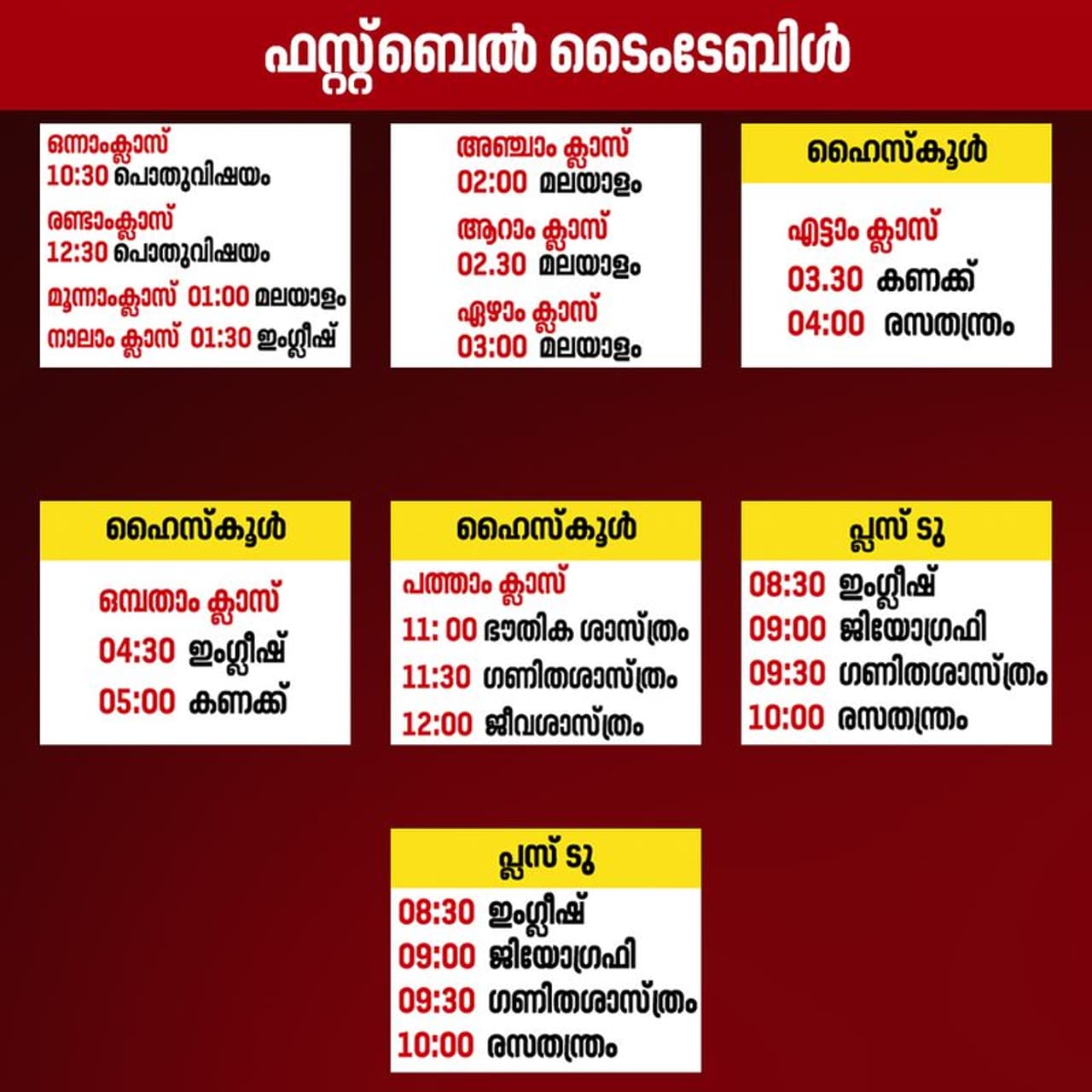 സംസ്ഥാനത്ത് ഇതാദ്യമായാണ് കുട്ടികൾ സ്കൂളിലേക്കെത്താതെ ക്ലാസ് തുടങ്ങുന്നത്. വിക്ടേഴ്സ് ചാനലിലൂടെ രാവിലെ എട്ടര മുതൽ വൈകീട്ട് അഞ്ച് വരെയാണ് ക്ലാസുകൾ. അര മണിക്കൂർ വീതമാണ് വിദഗ്ധരുടെ ക്ലാസ്. ഓരോ ക്ലാസുകളിലും ഓരോ സമയം ഏത് വിഷയത്തിലുള്ള ക്ലാസുകളായിരിക്കുമെന്ന് ടൈം ടേബിൾ വിദ്യാഭ്യാസ വകുപ്പ് പുറത്തിറക്കി.