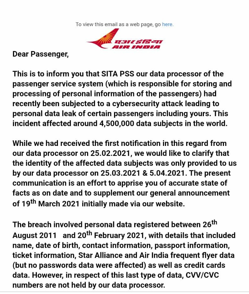 ക്രഡിറ്റ് കാർഡ്, പാസ്പോർട്ട് നമ്പർ അടക്കമുള്ള വിവരങ്ങൾ ചോർന്നു. 45 ലക്ഷം ഡാറ്റ സെറ്റ് ഹാക്കർമാർ ചോർത്തിയെന്നാണ് പ്രാഥമിക വിവരം. അന്വേഷണം നടക്കുകയാണെന്നാണ് എയർ ഇന്ത്യ അറിയിക്കുന്നത്