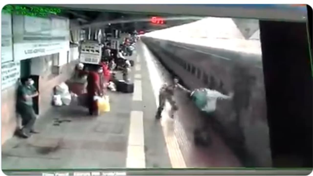 മുംബൈയിലെ കല്യാണ് റെയില്വേ സ്റ്റേഷനിലാണ് സംഭവം. സ്റ്റേഷനിലൂടെ കടന്നു പോകുകയായിരുന്നു ട്രെയിൻ. ഈ സമയത്ത് ട്രെയിനില് നിന്ന് ചാടിയ 52കാരൻ നിയന്ത്രണം വിട്ട് വീഴുകയായിരുന്നു. ട്രെയിന് ഓടുന്നതിന്റെ എതിര് ദിശയിലാണ് യാത്രക്കാരന് ചാടിയത്. നിയന്ത്രണം വിട്ട് യാത്രക്കാരന് വീഴുന്നത് ശ്രദ്ധയില്പ്പെട്ട റെയില്വേ സുരക്ഷാ ഉദ്യോഗസ്ഥന് രക്ഷയ്ക്ക് എത്തുന്നത് വീഡിയോയിൽ കാണാം.