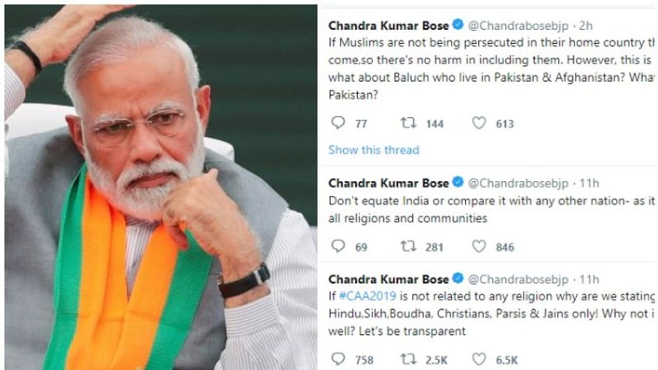 ദില്ലി: പൗരത്വ ഭേദഗതി നിയമത്തിൽ രാജ്യവ്യാപകമായി പ്രതിപക്ഷ സംഘടനകൾ പ്രക്ഷോഭം ശക്തമാക്കുന്നതിനിടെ നിയമത്തിനെതിരെ ബിജെപിക്ക് അകത്തും എതിര്സ്വരം. നിയമത്തിൽ ഒറ്റക്കെട്ടാണെന്ന് പ്രധാനമന്ത്രി അടക്കമുള്ളവര് ആവര്ത്തിക്കുമ്പോഴാണ് പാര്ട്ടിക്ക് അകത്ത് നിന്ന് തന്നെ എതിര് സ്വരങ്ങൾ ഉണ്ടാകുന്നത്. നിയമഭേദഗതിയിൽ നിന്ന് എന്തുകൊണ്ട് മുസ്ലീങ്ങളെ ഒഴിവാക്കുന്നു എന്നാണ് ബിജെപിയുടെ പശ്ചിമ ബംഗാൾ വൈസ് പ്രസിഡന്റ് ചന്ദ്രകുമാര് ബോസിന്റെ ട്വീറ്റ്. ഇന്ത്യ എല്ലാവര്ക്കും ഉള്ള ഇടമാണെവന്നും ചന്ദ്രകുമാര് ബോസ് അഭിപ്രായപ്പെട്ടു.