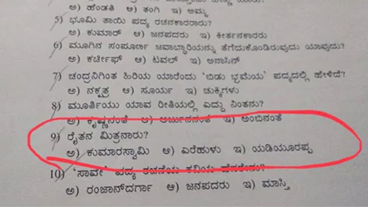 കർഷകരുടെ സുഹൃത്ത് ആരാണെന്ന് ചോദ്യത്തിന് മണ്ണിര, ബിജെപി നേതാവ് ബിഎസ് യെദ്യൂരപ്പ, കർണാടക മുഖ്യമന്ത്രി എച്ച് ഡി കുമാരസ്വാമി എന്നിങ്ങനെയായിരുന്നു ഓപ്ഷൻസ്. ബംഗളൂരുവിലെ മൗണ്ട് കാരമൽ ഇംഗ്ലീഷ് ഹൈസ്കൂളിലെ അധ്യാപകനെയാണ് ജോലിയിൽ നിന്ന് പിരിച്ച് വിട്ടത്.