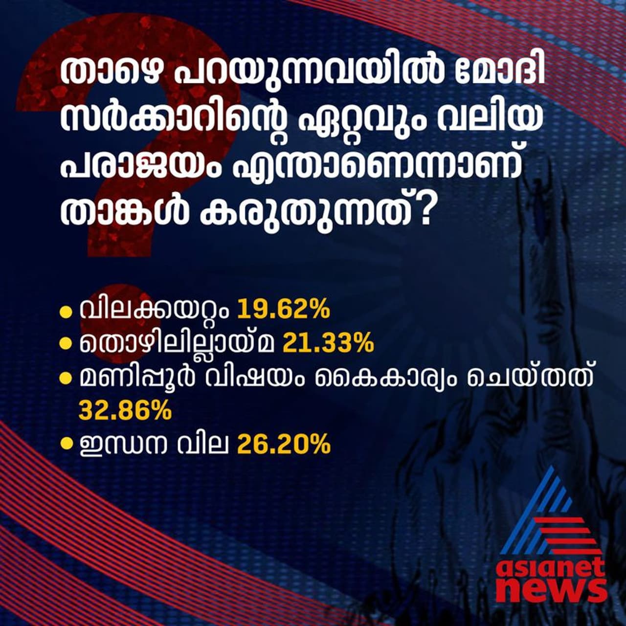 അതേസമയം മോദി സര്ക്കാരിന്റെ ഏറ്റവും വലിയ പരാജയം മണിപ്പൂര് വിഷയം കൈകാര്യം ചെയ്തതാണെന്ന് 32.86 ശതമാനം പേര് മറുപടി നല്കി. കുതിച്ചുയരുന്ന ഇന്ധന വില എന്ന് 26.2 ശതമാനം പേര് പറഞ്ഞു. തൊഴിലില്ലായ്മ എന്നാണ് 21.3 ശതമാനം പേരുടെ അഭിപ്രായം. 19.6 ശതമാനം പേര് വിലക്കയറ്റമാണ് സര്ക്കാരിന്റെ ഏറ്റവും വലിയ പരാജയമെന്ന് വിലയിരുത്തി. ഹിന്ദി ഹൃദയഭൂമിയില് നിന്നുള്ളവരുടെ ഏറ്റവും വലിയ ആശങ്ക തൊഴിലില്ലായ്മയാണ് (36.7 ശതമാനം). എന്നാൽ തമിഴ്നാട്ടിലെ വോട്ടര്മാര് വിലക്കയറ്റം (41.79 ശതമാനം) എന്നാണ് രേഖപ്പെടുത്തിയത്.