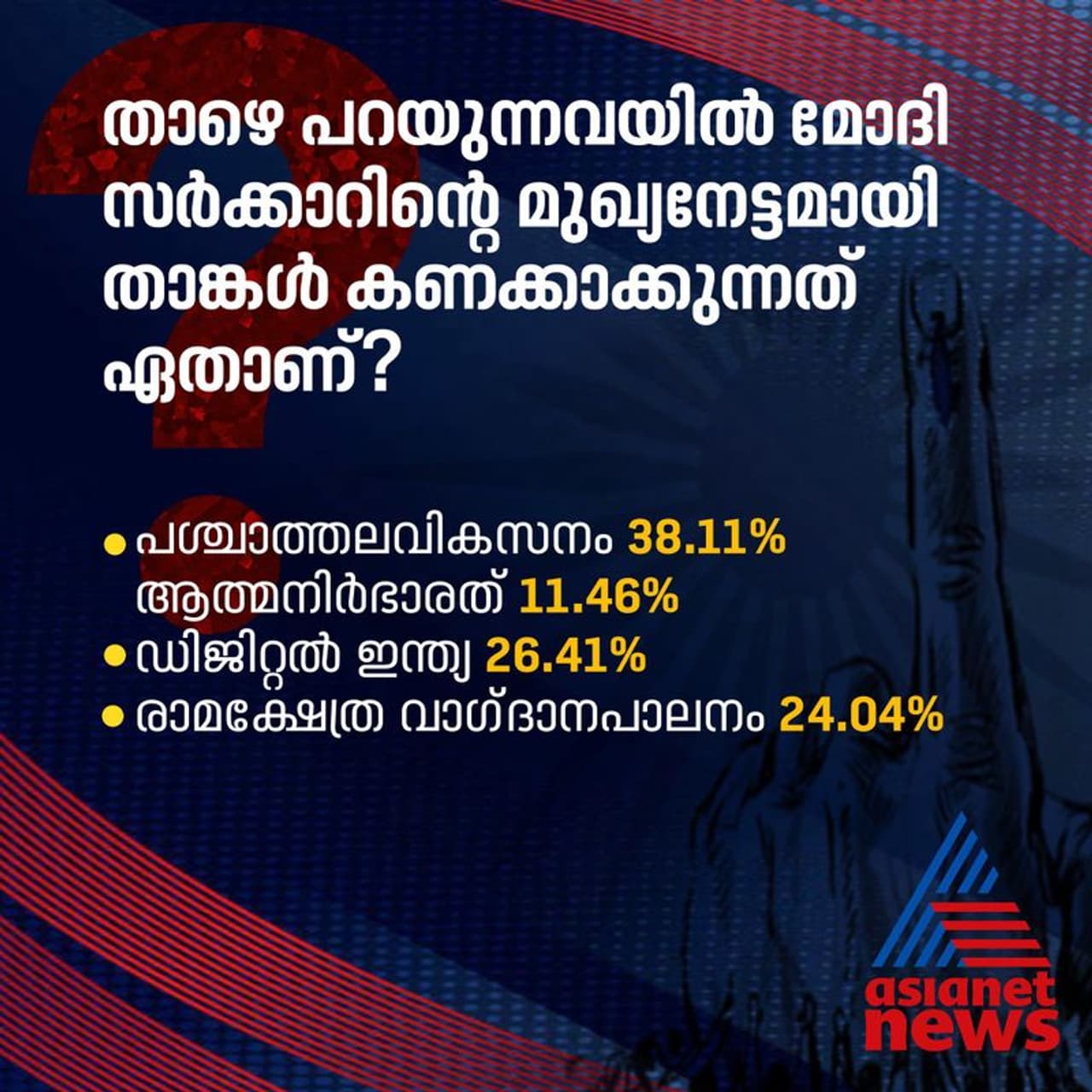 നരേന്ദ്ര മോദി സര്ക്കാരിന്റെ മുഖ്യനേട്ടമായി കാണുന്നത് എന്താണെന്ന ചോദ്യത്തിന് 38.11 ശതമാനം പേരുടെ മറുപടി പശ്ചാത്തല വികസനം എന്നാണ്. 26.41 ശതമാനം പേര് ഡിജിറ്റല് ഇന്ത്യ പദ്ധതിക്ക് വോട്ട് ചെയ്തു. 11.46 ശതമാനം പേര് ആത്മനിര്ഭര് ഭാരത് എന്നാണ് അഭിപ്രായപ്പെട്ടത്.