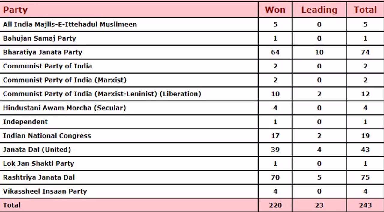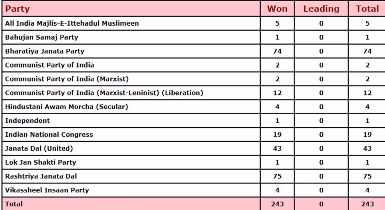 242 മണ്ഡലങ്ങളിലും തെരഞ്ഞെടുപ്പ് കമ്മീഷന് ഔദ്യോഗികമായി ഫലം പ്രഖ്യാപിച്ചു. ഇനി ഒരു മണ്ഡലത്തിലെ അന്തിമ ഫലം മാത്രമാണ് പുറത്തുവരാനുള്ളത്. ഇവിടെ ജെ.ഡി.യു ലീഡ് ചെയ്യുകയാണ്.