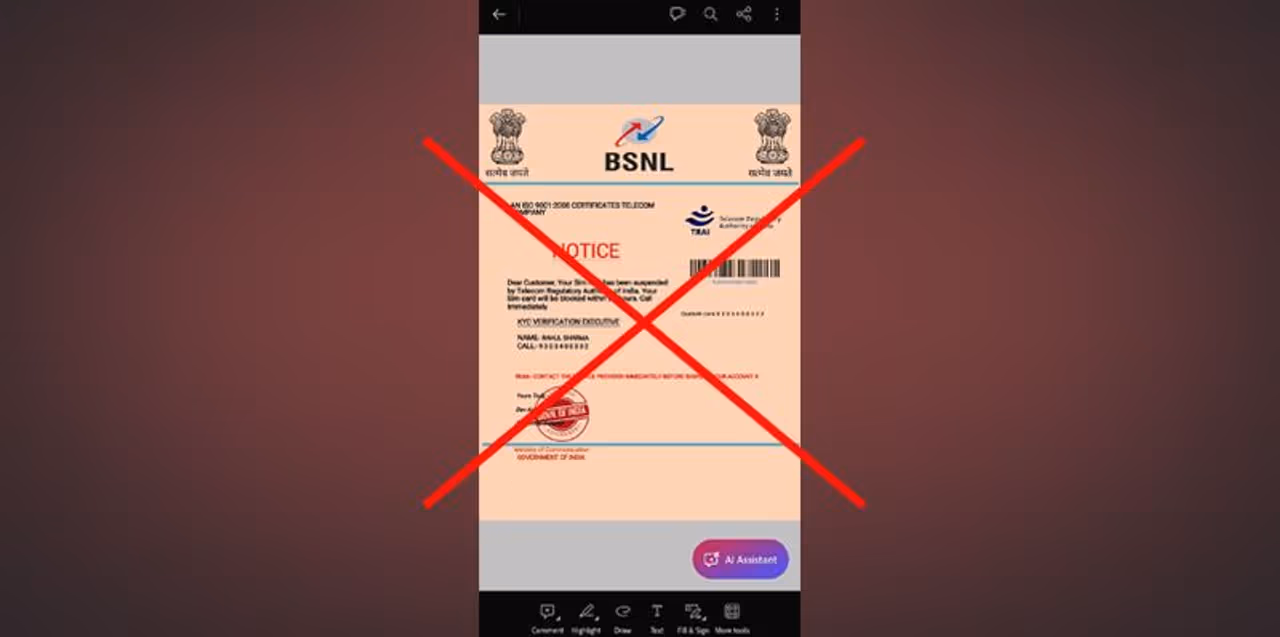 കെവൈസി അപ്ഡേറ്റ് ചെയ്തില്ലെങ്കില് 24 മണിക്കൂറിനകം സിം കാര്ഡ് ബ്ലോക്ക് ചെയ്യപ്പെടും എന്ന പ്രചാരണം വ്യാജമാണ് എന്ന് പ്രസ് ഇന്ഫര്മേഷന് ബ്യൂറോയുടെ ഫാക്ട് ചെക്ക് വിഭാഗം അറിയിച്ചു. പ്രചരിക്കുന്ന നോട്ടീസ് വ്യാജമാണ്, ബിഎസ്എന്എല് ഒരിക്കലും ഇത്തരം നോട്ടീസുകള് പുറത്തിറക്കാറില്ല എന്നും പിഐബിയുടെ ട്വീറ്റിലുണ്ട്. ബിഎസ്എന്എല് സിം കാര്ഡ് ബ്ലോക്ക് ചെയ്യുമെന്ന തരത്തിലുള്ള സന്ദേശം മുമ്പും സാമൂഹ്യമാധ്യമങ്ങളില് പ്രചരിച്ചിട്ടുണ്ട്.