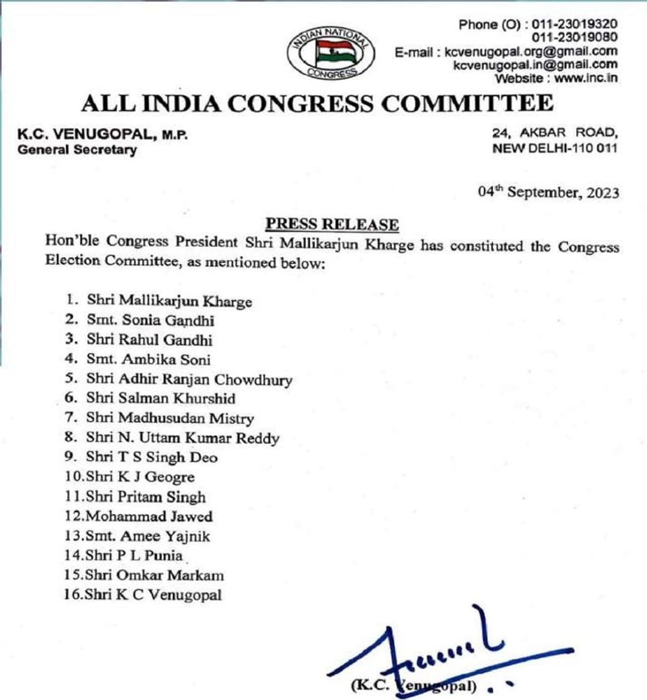 ദില്ലി : 2024 ലെ ലോക്സഭാ തെരഞ്ഞെടുപ്പിന് മുന്നോടിയായി കോൺഗ്രസ് തെരഞ്ഞെടുപ്പ് സമിതി രൂപീകരിച്ചു.16 അംഗ സമിതിയിൽ ദേശീയ അധ്യക്ഷൻ മല്ലികാർജുന ഖർഗെ, മുൻ പ്രസിഡന്റ് സോണിയ ഗാന്ധി, രാഹുൽ ഗാന്ധി, അംബികാസോണി, അധിർരഞ്ജൻ ചൌധരി അടക്കം അംഗങ്ങളാണ്. കേരളത്തിൽ നിന്നും സംഘടനാ ചുമതലയുള്ള ജനറൽ സെക്രട്ടറി കെ. സി വേണുഗോപാലും സമിതിയിൽ അംഗമാണ്. അടുത്ത 16ന് കോൺഗ്രസ് പ്രവർത്തക സമിതിയുടെ ആദ്യ യോഗം തെലങ്കാനയിൽ ചേരാനിരിക്കെയാണ് തെരഞ്ഞെടുപ്പ് സമിതി പ്രഖ്യാപനം.