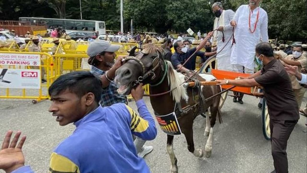 സിദ്ധരാമയ്യ, കര്ണാടക കോണ്ഗ്രസ് അധ്യക്ഷന് ഡി കെ ശിവകുമാര് അടക്കം മുഴുവന് കോണ്ഗ്രസ് അംഗങ്ങളും കുതിരവണ്ടിയിലാണ് സഭയിലെത്തിയത്.