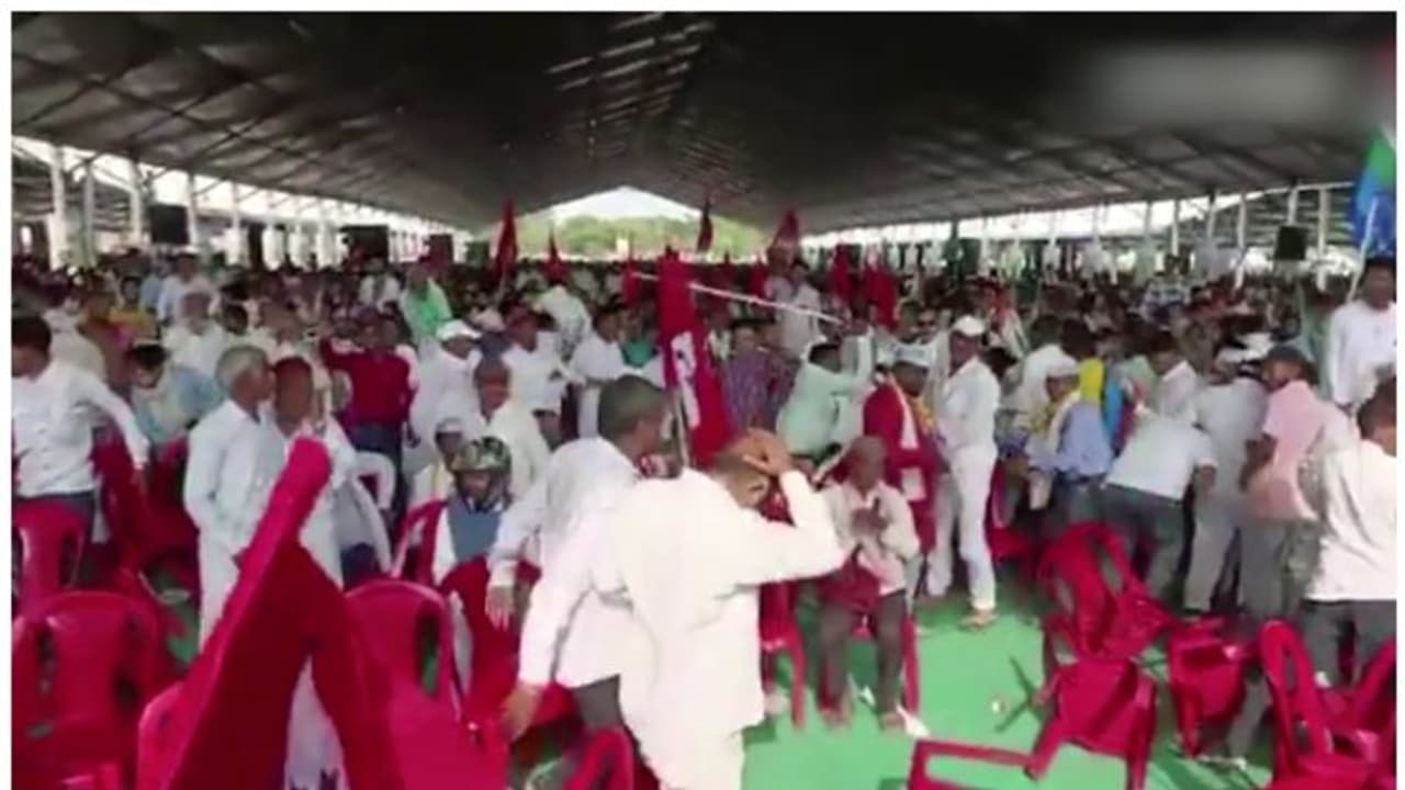 നേതാക്കള് വേദിയിലിരിക്കുമ്പോള് അസഭ്യം പറഞ്ഞും കസേര വലിച്ചെറിഞ്ഞും പ്രവര്ത്തകര് ഏറ്റുമുട്ടി. രണ്ട് പ്രവര്ത്തകര്ക്ക് പരിക്കേറ്റു.