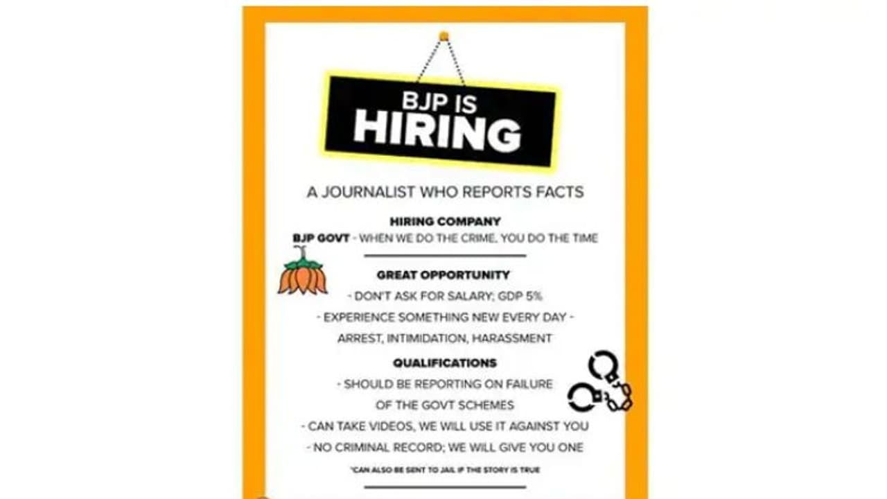 ജിഡിപി അഞ്ച് ശതമാനം മാത്രമാണ്, ശമ്പളം ചോദിക്കരുത്. എല്ലാ ദിവസവും അറസ്റ്റ്, ഭീഷണിപ്പെടുത്തല്, അപമാനിക്കല് തുടങ്ങിയ പുതിയ കാര്യങ്ങള് ഉണ്ടാകും. ഏതെങ്കിലും സര്ക്കാര് പദ്ധതിയുടെ പരാജയം സംബന്ധിച്ച് റിപ്പോര്ട്ട് ചെയ്ത് പരിചയം വേണമെന്നതാണ് പ്രധാന യോഗ്യത. വീഡിയോ എടുത്താല് അത് നിങ്ങള്ക്കെതിരെ പ്രയോഗിക്കും. ക്രിമിനല് പശ്ചാത്തലമില്ലെങ്കില് ഞങ്ങള് അത് നല്കും. നിങ്ങള് റിപ്പോര്ട്ട് ചെയ്യുന്ന വാര്ത്ത സത്യമാണെങ്കില് ഉറപ്പായും ജയിലിലയക്കും എന്നിങ്ങനെ പോകുന്നു പരസ്യത്തിലെ വാചകങ്ങള്. ബിജെപിയുടെ ചിഹ്നവും പരസ്യത്തില് ഉപയോഗിച്ചിട്ടുണ്ട്.