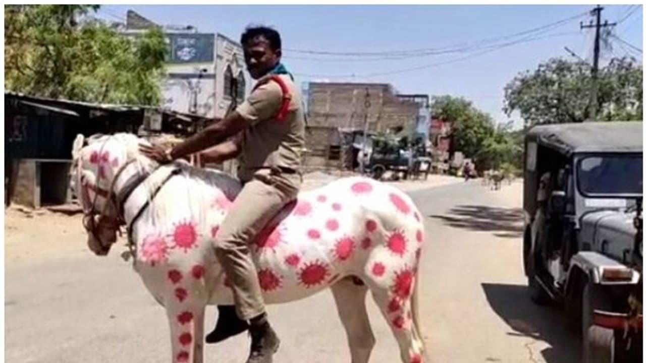 ആന്ധ്രയിലെ കുർനൂൽ ജില്ലയിലെ പ്യാപിലി പട്ടണത്തിൽ എസ് ഐ മാരുതി ശങ്കർ എത്തിയത് കുതിരപ്പുറത്താണ്. അതിലെന്താണ് അസ്വാഭാവികത എന്ന് തോന്നാം. എന്നാൽ കുതിരെയെ നോക്കിയാൽ എന്തിനാണ് അദ്ദേഹം കുതിരയെ തന്നെ സവാരിക്ക് തെരഞ്ഞെടുത്തത് എന്ന് മനസ്സിലാകും. വെള്ള നിറമാണ് കുതിരയ്ക്ക്. അതിന്റെ ശരീരത്തിലുടനീളം ചുവപ്പ് നിറത്തിൽ കൊവിഡ് 19 വൈറസിന്റെ ഘടനാ ചിത്രം വരച്ചു ചേർത്തിരിക്കുന്നു. ലോകത്തെങ്ങും ഭീതി പരത്തി വ്യാപിച്ചു കൊണ്ടിരിക്കുന്ന കൊറോണ വൈറസിനെതിരെ വ്യത്യസ്തമായി ബോധവത്കരണം നടത്തുകയാണ് ഇദ്ദേഹം.