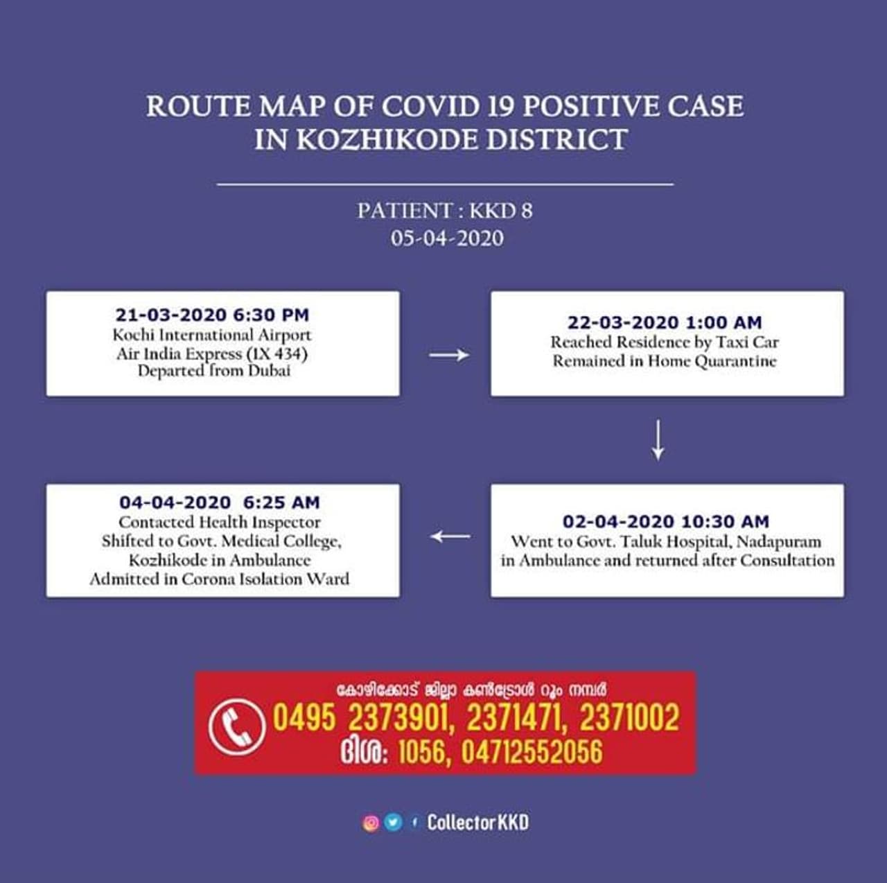 ദുബൈയിൽ നിന്ന് കോഴിക്കോടെത്തി കൊവിഡ് രോഗം ബാധിച്ച് ചികിത്സയിൽ കഴിയുന്ന വ്യക്തിയുടെ റൂട്ട് മാപ്പ് ജില്ലാ ഭരണകൂടം പുറത്തുവിട്ടു.