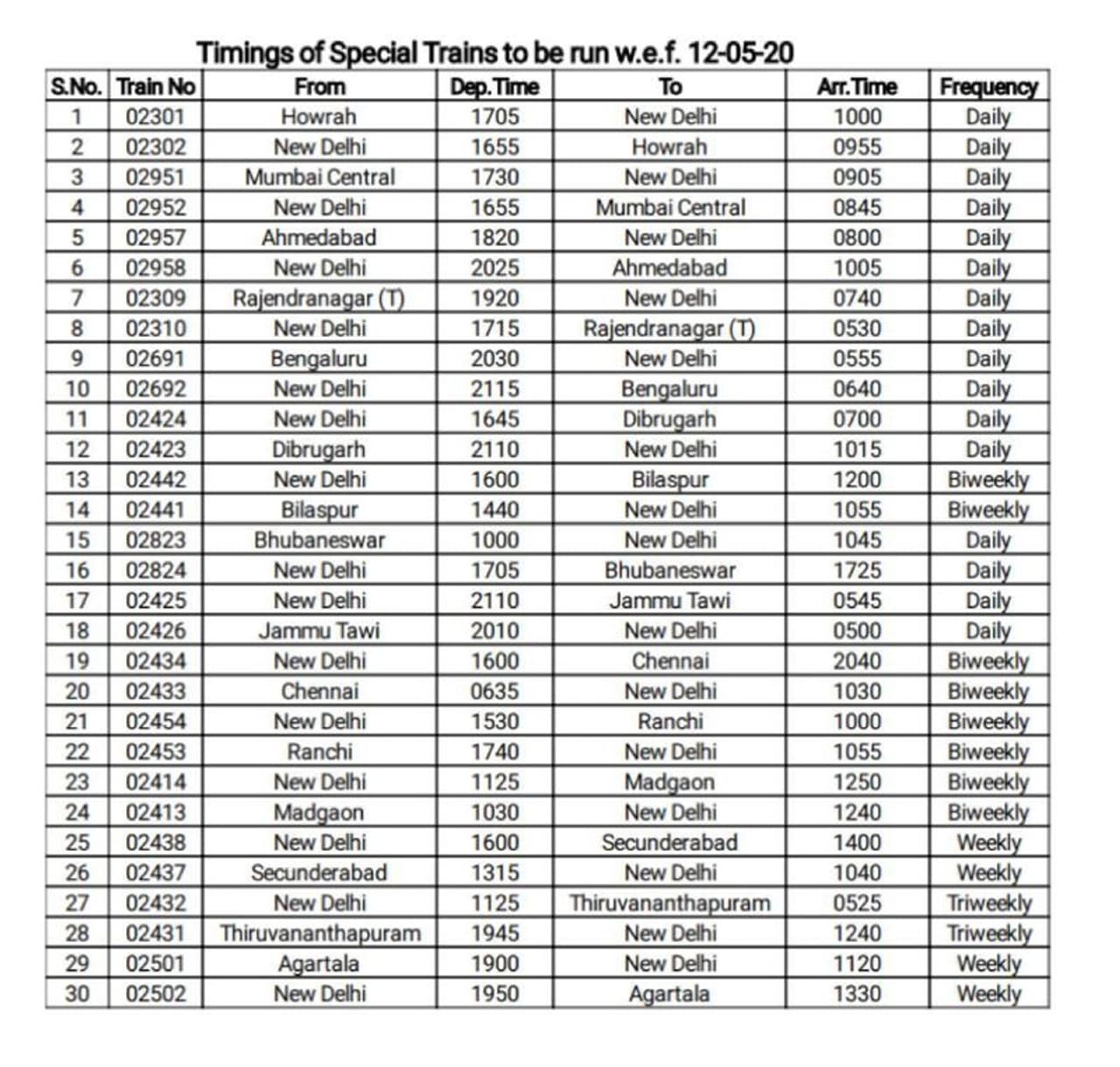 ഹൗറ, രാജേന്ദ്രനഗർ, ദിബ്രുഗഡ്, ജമ്മുതാവി, ബിലാസ്പുർ, റാഞ്ചി, മുംബൈ, അഹമ്മദാബാദ്, അഗർത്തല, ഭുവനേശ്വർ, മഡ്ഗാവ്, സെക്കന്തരബാദ് എന്നിവടങ്ങളിൽ നിന്നും ദില്ലിയിലേക്കും തിരിച്ചും സ്പെഷ്യൽ ട്രെയിനുകളുണ്ട്.