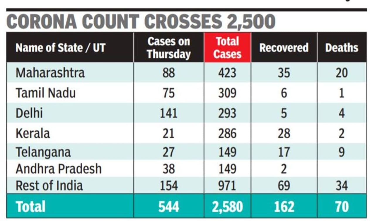 അങ്ങനെ ആകെ ഇന്നലെ മാത്രം സംസ്ഥാനങ്ങളുടെ വിവരങ്ങളെല്ലാം ചേർത്താൽ 544 കേസുകൾ റിപ്പോർട്ട് ചെയ്യപ്പെട്ടു. ആകെ കേസുകളുടെ എണ്ണം 2580. രോഗം ഭേദമായവരുടെ എണ്ണം 162. ആകെ മരണം 70.