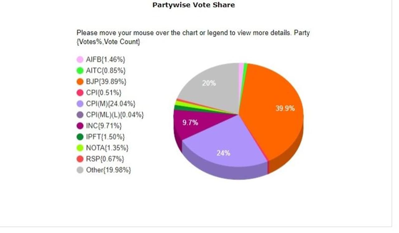 സംസ്ഥാനത്ത് തെരഞ്ഞെടുപ്പ് കമ്മീഷൻ പുറത്തുവിട്ട ഔദ്യോഗിക കണക്കുകൾ പ്രകാരം 29 സീറ്റിലാണ് ബിജെപി മുന്നേറ്റം. സിപിഎം 12 സീറ്റിൽ മുന്നിലുണ്ട്. അഞ്ച് സീറ്റിൽ കോൺഗ്രസും ഒരിടത്ത് സ്വതന്ത്ര സ്ഥാനാർത്ഥിയുമാണ് മുന്നിലുള്ളത്. ഒറ്റയ്ക്ക് മത്സരിച്ച തിപ്ര മോത പാർട്ടി 12 സീറ്റിലാണ് മുന്നിലുള്ളത്.