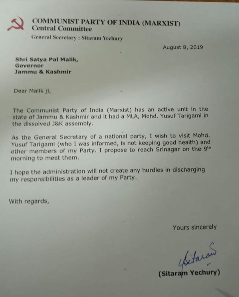 കാശ്മീരിൽ സിപിഎമ്മിന് സ്വാധീനമുണ്ടെന്നും ദേശീയ പാർട്ടിയുടെ ജനറൽ സെക്രട്ടറിയെന്ന നിലയിൽ തന്നെയും മറ്റ് നേതാക്കളെയും അദ്ദേഹത്തെ കാണാൻ അനുവദിക്കണം എന്നുമാണ് കത്തിലെ ആവശ്യം. ഭരണകൂടം ഒരു പാർട്ടി നേതാവെന്ന നിലയിൽ തന്റെ കർത്തവ്യം പൂർത്തിയാക്കുന്നതിന് തടസ്സം നിൽക്കില്ലെന്ന് പ്രതീക്ഷിക്കുന്നുവെന്ന് പറഞ്ഞാണ് യെച്ചൂരി കത്ത് അവസാനിപ്പിച്ചത്.