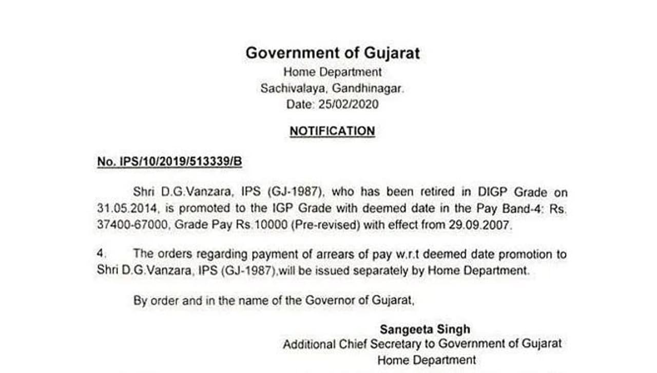 തുടര്ന്ന് 2015 ഫെബ്രുവരിയില് ജാമ്യം ലഭിച്ചു. 2017ലും 2019ലും രണ്ടു കേസുകളിലുമായി കോടതി വന്സാരയെ വെറുതെ വിട്ടു. ഈ സാഹചര്യത്തിലാണ് ആനുകൂല്യങ്ങളെല്ലാം അനുവദിച്ചത്. സസ്പെന്ഷന് മുതലുള്ള കാലയളവ് പരിഗണിച്ചാണ് വന്സാരയ്ക്ക് സ്ഥാനക്കയറ്റം നല്കിയത്.
