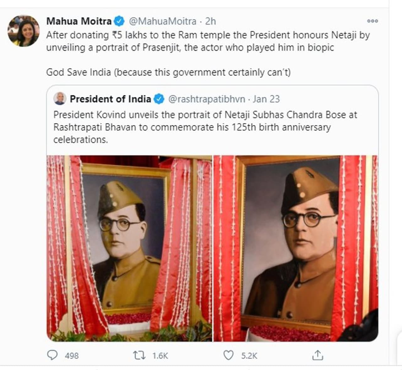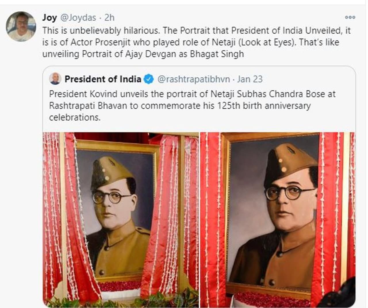 നേതാജി സുഭാഷ് ചന്ദ്ര ബോസിന്റെ 125-ാം ജന്മവാർഷിക ദിനമായ ജനുവരി 23, 'പരാക്രം ദിവസ്' ആയി ആഘോഷിക്കാൻ കേന്ദ്രസർക്കാർ തീരുമാനിച്ചിരുന്നു. അതിന്റെ ഭാഗമായി, അന്നേ ദിവസം രാഷ്ട്രപതി ഭവനിൽ ഒരു ഛായാചിത്രത്തിന്റെ അനാച്ഛാദനം നടന്നു. നേതാജിയുടെ ഫ്രെയിം ചെയ്ത ചിത്രം പ്രസിഡന്റ് രാംനാഥ് കോവിന്ദ് അനാച്ഛാദനം ചെയ്യുന്നതിന്റെ ചിത്രങ്ങൾ സഹിതം ഒരു ട്വീറ്റും ഏതാണ്ട് തത്സമയം തന്നെ രാഷ്ട്രപതിയുടെ ഔദ്യോഗിക ട്വിറ്റർ ഹാൻഡിലിൽ നിന്ന് പുറപ്പെട്ട.