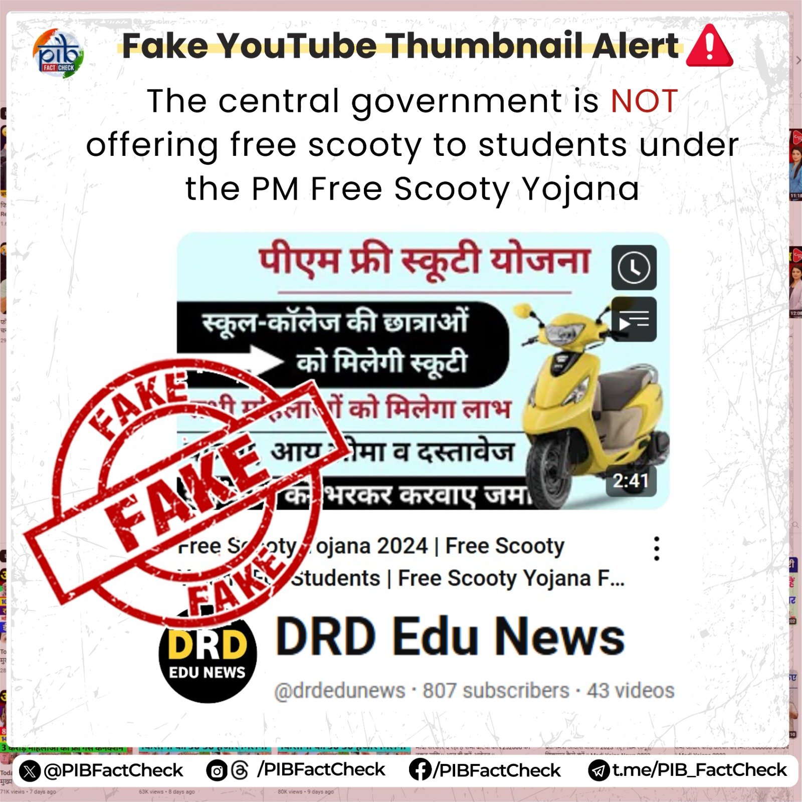 വിദ്യാര്ഥിനികള്ക്കുള്ള സൗജന്യ സ്കൂട്ടി വിതരണത്തെ കുറിച്ച് കഴിഞ്ഞ വര്ഷം മറ്റൊരു വ്യാജ പ്രചാരണവുമുണ്ടായിരുന്നു. സ്കൂള്/കോളേജ് വിദ്യാര്ഥിനികള്ക്ക് കേന്ദ്രം സൗജന്യമായി സ്കൂട്ടികള് വിതരണം ചെയ്യുന്നു എന്നായിരുന്നു ഒരു യൂട്യൂബ് വീഡിയോയുടെ തംബ്നൈലില് പറഞ്ഞിരുന്നത്. ഇത്തരമൊരു പദ്ധതി കേന്ദ്ര സര്ക്കാരിനില്ല എന്ന് അന്നും പിഐബി ഫാക്ട് ചെക്കിലൂടെ അറിയിച്ചിരുന്നു.