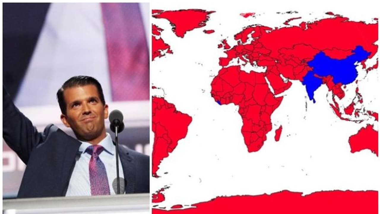 കശ്മീര് ഇല്ലാത്ത ഇന്ത്യയുടെ ഭൂപടമാണ് ഡൊണാള്ഡ് ട്രംപ് ജൂനിയര് ട്വീറ്റ് ചെയ്തത്. ട്രംപിന്റെ വിജയ ശേഷം ലോക ഭൂപടത്തിന്റെ ഇലക്ടറല് ഭൂപടം ഇങ്ങനെയാവുമെന്ന കുറിപ്പോടെയാണ് ട്വീറ്റ്