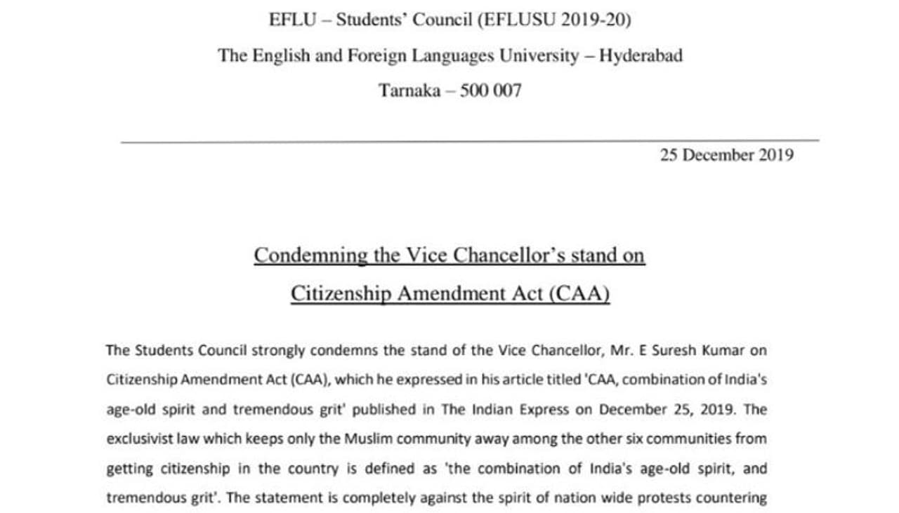 ഇതിനിടെ പൗരത്വ നിയമ ഭേദഗതിയെ അനുകൂലിച്ച പരസ്യനിലപാടെടുത്തയാളാണ് ഇഫ്ലു വൈസ് ചാന്സലര് ഇ സുരേഷ് കുമാര്. ഭേദഗതിയെ അനുകൂലിച്ച് ഇന്ത്യന് എക്സ്പ്രസില് വൈസ് ചാന്സലര് എഴുതിയ ലേഖനം വലിയ വിവാദമായിരുന്നു. ഇതില് സ്റ്റുഡന്റ് കൗണ്സില് പരസ്യ പ്രതിഷേധം രേഖപ്പെടുത്തിയിട്ടും വിസി നിലപാട് മാറ്റിയിട്ടില്ല.