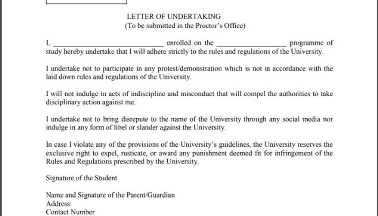ക്യാമ്പസിലെ പ്രതിഷേധങ്ങളില് പങ്കെടുക്കില്ല എന്ന് അഡ്മിഷന് സമയത്ത് ഒപ്പിട്ടുവാങ്ങുന്ന സമ്മതപത്രം ചൂണ്ടിക്കാട്ടിയാണ് സര്വകലാശാലയുടെ പ്രതികാരം